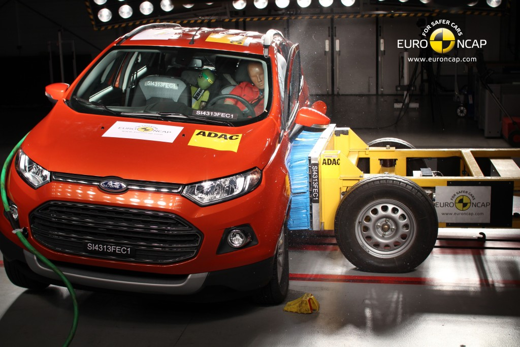 W teście zderzenia czołowego przedział dla podróżnych pozostał stabilny. Czujniki umieszczone na manekinach wykazały dobrą ochronę kolan i kości udowych kierowcy i pasażer zajmującego miejsce z przodu. Ford pokazał, że podobny poziom ochrony zostanie dostarczony pasażerom innych rozmiarów i zajmujących inne miejsca. EcoSport zdobył maksymalną ilość punktów za ochronę pasażera zajmującego miejsce z przodu za dobrą ochronę wszystkich regionów ciała. W teście bariery bocznej, ochrona wszystkich regionów ciała była dobra model zdobył maksymalną ilość punktów. Nawet w poważniejszym słupie bocznym zabezpieczenie przed uderzeniem klatki piersiowej było należyte i pozostałych regionów ciała było dobre. Przednie siedzenia i zagłówki zapewniły dobre zabezpieczenie przed urazem kręgosłupa szyjnego spowodowanym szarpnięciem podczas uderzenia w tył pojazdu.