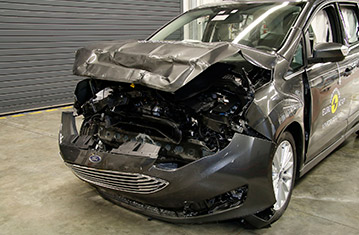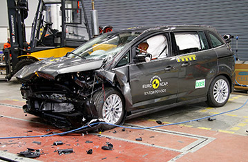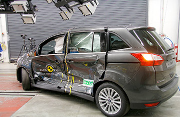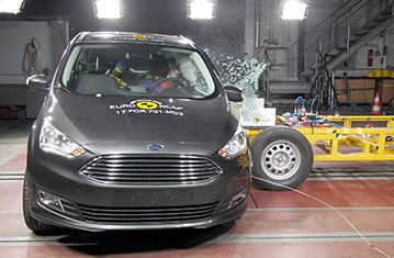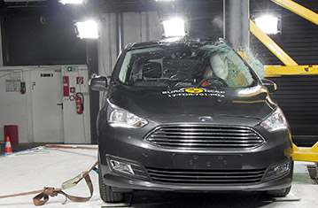 Ford Grand C-MAX oraz Ford C-MAX są identyczne, z wyjątkiem sposobu obsługi tylnych drzwi. Euro NCAP przetestowało cięższego Grand C-MAXa i wyniki tych prób zostały użyte w przedstawionej ocenie. Przedział pasażerski Grand C-MAXa pozostał stabilny w próbach zderzenia czołowego. Odczyty z manekinów wykazały dobra ochronę kolan i ud kierowcy oraz pasażera. Ford pokazał, że podobny poziom ochrony będzie zapewniony dla pasażerów o odmiennej posturze, siedzących w różnych pozycjach. W tej próbie, ochrona wszystkich krytycznych obszarów ciała pasażera była dobra. W próbie zderzenia ze sztywną barierą na pełnej szerokości, miednica kierowcy wysunęła się spod części biodrowej pasa bezpieczeństwa i ochrona tej części ciała została oceniona jako bardzo słaba. Odczyty ściśnięcia klatki piersiowej, zanotowane przez manekina, wykazały mierny poziom ochrony. Dla tylnego pasażera, kombinacja ściśnięcia klatki piersiowej i wysokiego obciążenia pasa ramiennego, wskazały bardzo słabą ochronę klatki piersiowej, natomiast ochrona szyi została oceniona jako mierna. W próbie bocznego zderzenia z barierą, ochrona wszystkich krytycznych obszarów ciała była dobra i Grand C-MAX zdobył maksymalną ilość punktów w tej próbie. W bardziej wymagającej próbie bocznego zderzenia z słupem, bazując na odczytach ściśnięcia żeber manekina, ochrona klatki piersiowej została oceniona jako mierna. W tym teście, przesuwne drzwi przemieściły się z przodu, tworząc szczelinę pomiędzy drzwiami, a nadwoziem, w rezultacie czego, wynik został obniżony. Próby przeprowadzone na przednich siedzeniach i zagłówkach wykazały dobrą ochronę przeciwko urazom kręgosłupa szyjnego w przypadku uderzenia w tył pojazdu. Geometryczna ocena tylnych siedzeń wskazała mierną ochronę kręgosłupa szyjnego. Samochody od numeru VIN WF0WXXGCEWHE77742 posiadają w standardzie autonomiczny system hamowania awaryjnego. W próbach działania przy niskich prędkościach, kiedy dochodzi do wielu urazów kręgosłupa, system spisał się na wystarczającym poziomie.