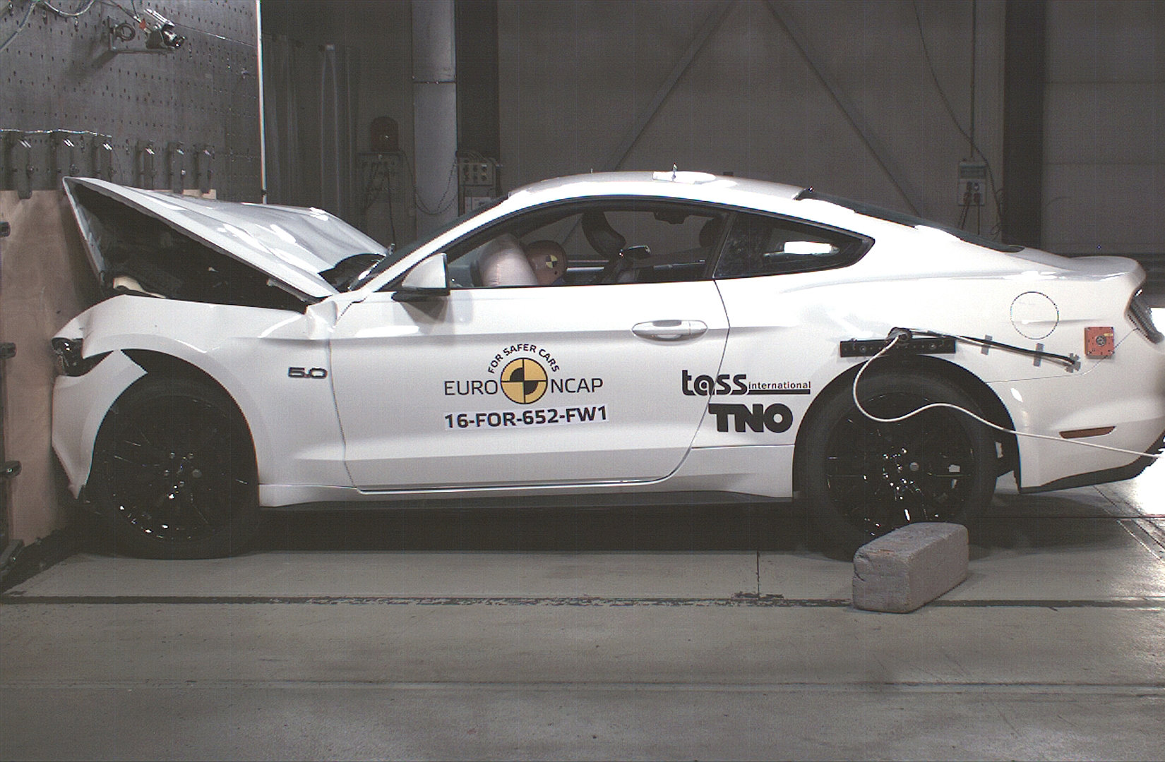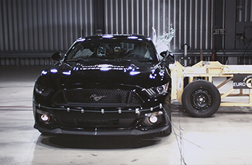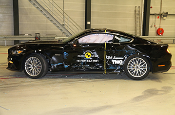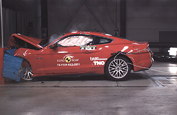 Przedstawiona ocena opiera się na samochodzie będącym w sprzedaży od 2015 roku. Ford poinformował Euro NCAP, że zamówienia złożone od maja otrzymają zmodernizowaną wersję samochodu, która zostanie wprowadzona w 2017 roku i będzie wyposażona w system zapobiegający kolizji (wykrywanie pieszych, ostrzeżenie przed kolizją z przodu oraz autonomiczny system hamowania awaryjnego) oraz system wspomagający utrzymanie na pasie ruchu. Przedstawiona ocena opiera się na samochodzie będącym w sprzedaży od 2015 roku. Ford poinformował Euro NCAP, że zamówienia złożone od maja otrzymają zmodernizowaną wersję samochodu, która zostanie wprowadzona w 2017 roku i będzie wyposażona w system zapobiegający kolizji (wykrywanie pieszych, ostrzeżenie przed kolizją z przodu oraz autonomiczny system hamowania awaryjnego) oraz system wspomagający utrzymanie na pasie ruchu. Przedział pasażerski Mustanga pozostał stabilny w testach zderzenia czołowego z odkształcalną barierą. Odczyty z manekinów wykazały dobrą ochronę kolan i ud kierowcy oraz pasażera. Analizy danych z manekina wykazały, że głowa kierowcy zapadła się w poduszce powietrznej, oznacza to, że w poduszce było niewystarczające ciśnienie, aby zapobiec kontaktowi głowy z kierownicą przez materiał opróżnionej poduszki. Głowa manekina pasażera również zapadła się w poduszce powietrznej w kierunku deski rozdzielczej, co wynikało z niewystarczającego ciśnienia w poduszce i niedostatecznego utrzymania pasażerów większej postury przez ogranicznik obciążenia pasów bezpieczeństwa. Wynik kierowcy i pasażera został obniżony za działanie poduszki powietrznej. W próbie na pełnej szerokości sztywnej bariery ochrona kierowcy była dobra, poza klatką piersiową której ochrona była wystarczająca. Natomiast pasażer tylnego siedzenia wsunął się pod część biodrową pasa bezpieczeństwa (zjawisko zwane "nurkowaniem") i wynik dla kolan, ud i miednicy został obniżony, a ochrona została oceniona jako bardzo słaba. Ochrona klatki piersiowej została również oceniona jako bardzo słaba jako, że tylny pas bezpieczeństwa (który nie posiada ani napinaczy, ani ograniczników obciążenia) wykazał w teście nadmiernie wysokie siły rozciągające. Odczyty z manekina dotyczące przeciążeń głowy, wskazały słabą ochronę głowy dla tylnego pasażera. W bocznym zderzeniu z barierą, Mustang zdobył maksymalną ilość punktów z dobrą ochroną wszystkich krytycznych obszarów ciała. Nawet w bardziej wymagającej próbie bocznego zderzenia z słupem, ochrona klatki piersiowej była wystarczająca, a pozostałych obszarów ciała dobra. Testy przednich foteli i zagłówków wykazały mierny poziom ochrony przeciwko urazom kręgosłupa szyjnego w przypadku uderzenia w tył pojazdu. Geometryczna ocena tylnych siedzeń wykazała zły poziom ochrony kręgosłupa szyjnego na tych miejscach. Obecny Mustang nie jest wyposażony w autonomiczny system hamowania awaryjnego (AEB), który mógłby zapewnić lepszą ochronę kręgosłupa szyjnego. Natomiast, Ford oświadczył, że następna wersja Mustanga będzie posiadała AEB.