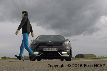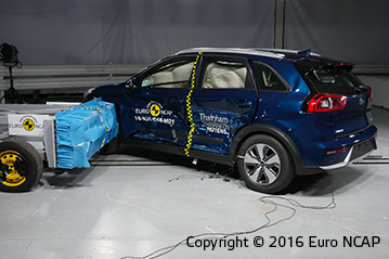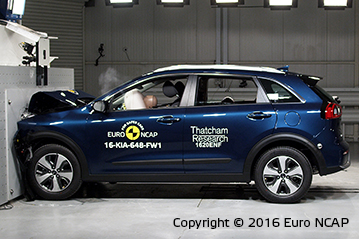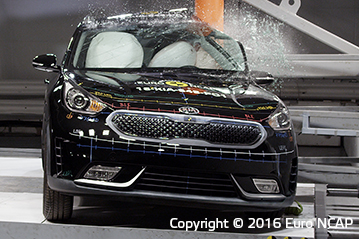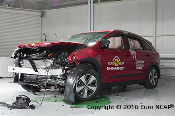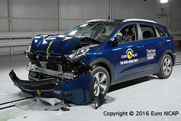 Przedział pasażerski pozostał stabilny w testach zderzenia czołowego. Odczyty z manekinów wykazały dobrą ochronę kolan i ud kierowcy i pasażera. Niro pokazała, że podobny poziom ochrony będzie zapewniony dla pasażerów o różnych rozmiarach oraz siedzących na różnych miejscach. W próbie na pełnej szerokości sztywnej bariery ochrona kierowcy była dobra lub wystarczająca. Natomiast ochrona pasażerów tylnych siedzeń została oceniona jako słaba dla klatki piersiowej oraz bardzo słaba dla miednicy. Odczyty z manekinów wykazały, że wsunęła się pod pas bezpieczeństwa zamiast zostać prawidłowo przytrzymana. . W bocznym zderzeniu z barierą oraz w trudniejszej próbie zderzenia bocznego z słupem, Niro zdobyła maksymalną ilość punktów z dobrą ochroną dla wszystkich krytycznych obszarów ciała. Testy pokazały dobrą ochronę dla pasażerów przednich siedzeń oraz powstrzymanie głowy przed urazami kręgów szyjnych w próbie uderzenia z tyłu. Ocena geometryczna tylnych siedzeń wykazała marginalną ochronę. Dodatkowa ochrona przed urazami kręgów szyjnych jest dostępna przy Pakiecie Aktywnego Wspomagania Jazdy, który zawiera autonomiczny system awaryjnego hamowania działający przy niskich prędkościach typowych dla ruchu miejskiego. System wypadł dobrze w testach Euro NCAP.