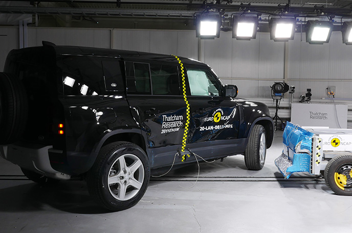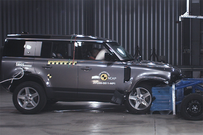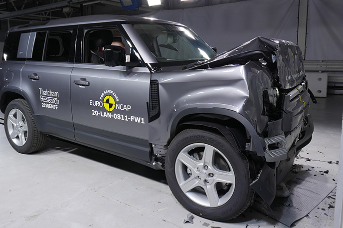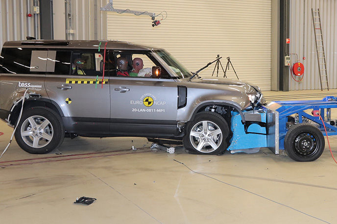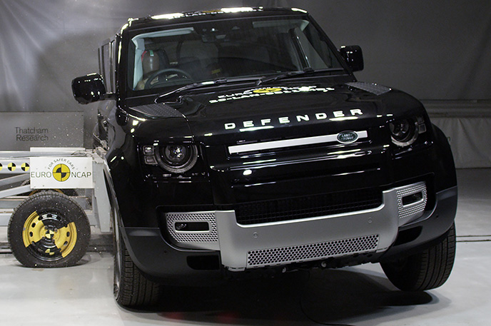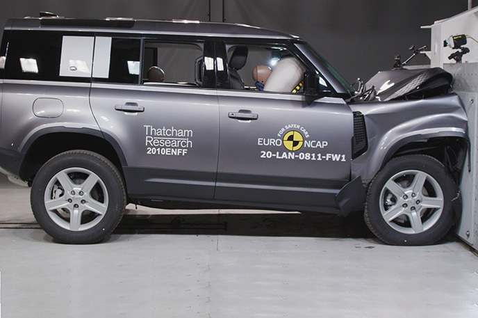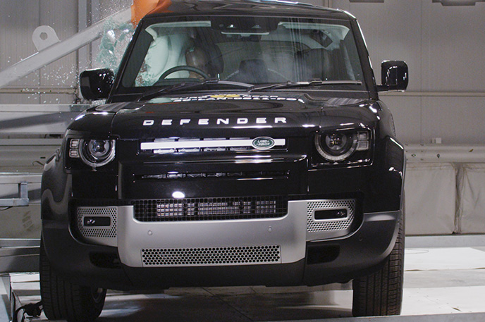 Przedział pasażerski Land Rovera Defender pozostał stabilny w próbach zderzenia czołowego. Odczyty z manekinów, ze względu na sztywną strukturę deski rozdzielczej, wykazały marginalną ochronę kolan i ud zarówno kierowcy jak i pasażera. Duża masa i przednia konstrukcja pojazdu sprawiają, że jest on agresywnym partnerem zderzającego się pojazdu, w wyniku czego wynik w teście przedniego przesunięcia został odpowiednio obniżony. W próbie zderzenia ze sztywną barierą na pełnej szerokości, ochrona wszystkich krytycznych obszarów ciała kierowcy oraz pasażera, była dobra lub wystarczająca, za wyjątkiem klatki piersiowej pasażera z tyłu, której ochrona została oceniona jako marginalna na podstawie odczytów ucisku klatki piersiowej. Zarówno w teście bocznego zderzenia z barierą, przedstawiającym zderzenie z innym pojazdem, jak i przy silniejszym uderzeniu bocznym w słup, ochrona była dobra pod każdym względem, a Defender zdobył maksymalną liczbę za te testy. W ocenie ochrony przed wypadnięciem manekina (jego ruch w kierunku drugiej strony pojazdu) w przypadku zderzenia bocznego zostało ocenione jako wystarczające. Defender nie został wyposażony w środkowe poduszki powietrzne, które chronią przed interakcją między pasażerami podczas zderzeń bocznych. Próby przeprowadzone na przednich siedzeniach i zagłówkach, wykazały dobrą ochronę odcinka szyjnego kręgosłupa w przypadku uderzenia w tył pojazdu. Geometryczna ocena tylnych siedzeń, również wykazała dobrą ochronę odcinka szyjnego kręgosłupa. Defender posiada w standardowym wyposażeniu autonomiczny system hamowania po kolizyjnego, który uruchamia hamulce natychmiast po zderzeniu, aby zapobiec udziałowi pojazdu w zderzeniu wtórnym. Pojazd posiada również zaawansowany system e-Call, który w razie wypadku automatycznie wysyła wiadomość do służb ratunkowych podając lokalizację pojazdu.
