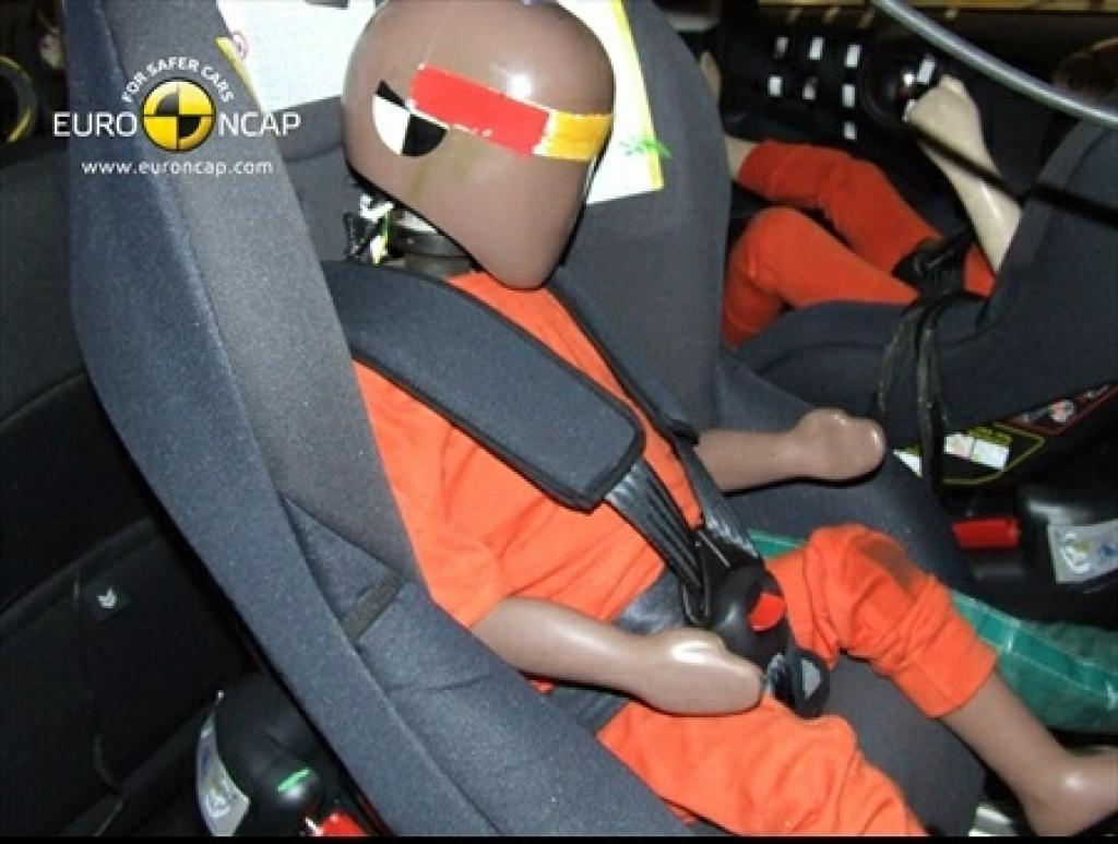 W trakcie zderzenia czołowego, przednie przesunięcie głowy 3-latka, siedzącego w foteliku przodem, nie było nadmierne, oba manekiny były dobrze chronione przez foteliki. Testowany model nie był wyposażony w przycisk dezaktywujący poduszkę powietrzną pasażera by umożliwić montaż fotelika tyłem. Etykiety ostrzegające przed użyciem fotelika bez unieruchomienia poduszki są jasne i wyraźne. MINI pracuje nad ulepszeniem oznaczenia górnych mocowań w aucie.