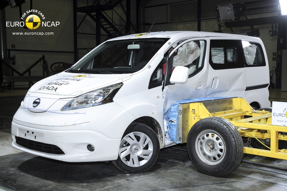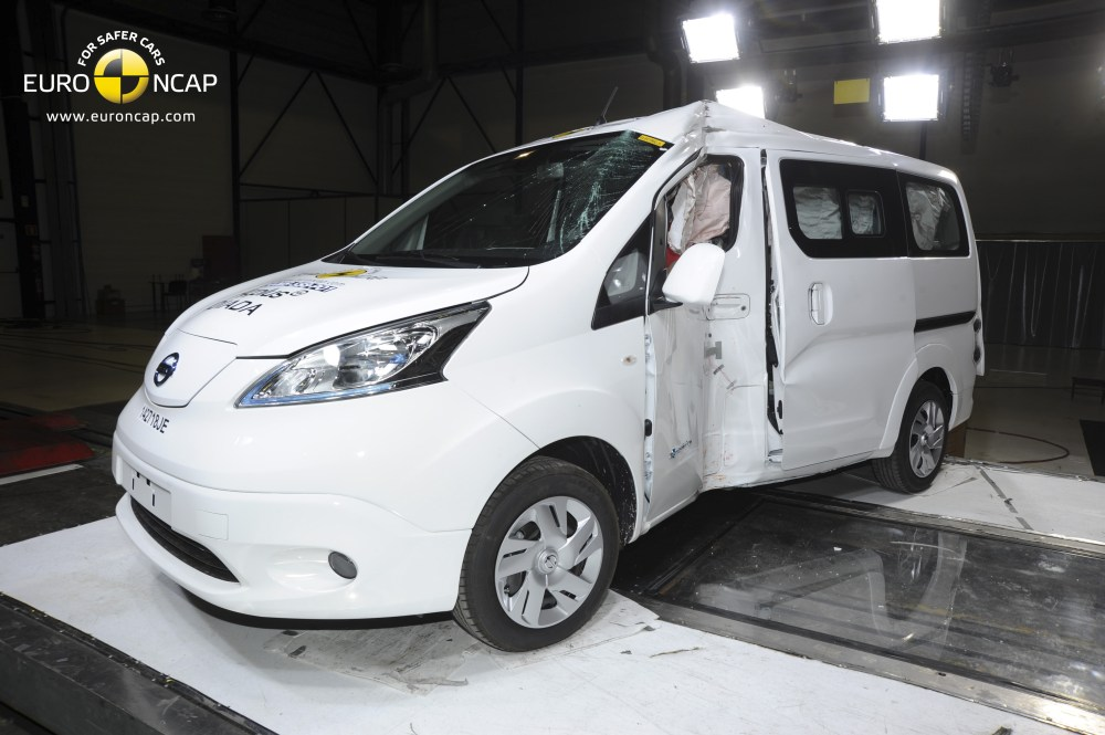 Przedział dla podróżnych e-NV 200 Evalia pozostał stabilny w teście zderzenia czołowego.Czujniki na manekinach wykazały dobrą ochronę kolan i kości udowych kierowcy i pasażera. Uznano jednak, że niektóre elementy deski rozdzielczej oraz kolumny kierowniczej mogą stanowić ryzyko urazu ciała. W teście bariery bocznej ochrona wszystkich regionów ciała była dobra, jedynie klatki piersiowej była odpowiednia. W poważniejszym teście słupa bocznego czujniki wykazały marginalną ochronę klatki piersiowej. Miejsca i zagłówki zapewniły marginalną ochronę przed urazami kręgosłupa szyjnego w sytuacji uderzenia w tył pojazdu.