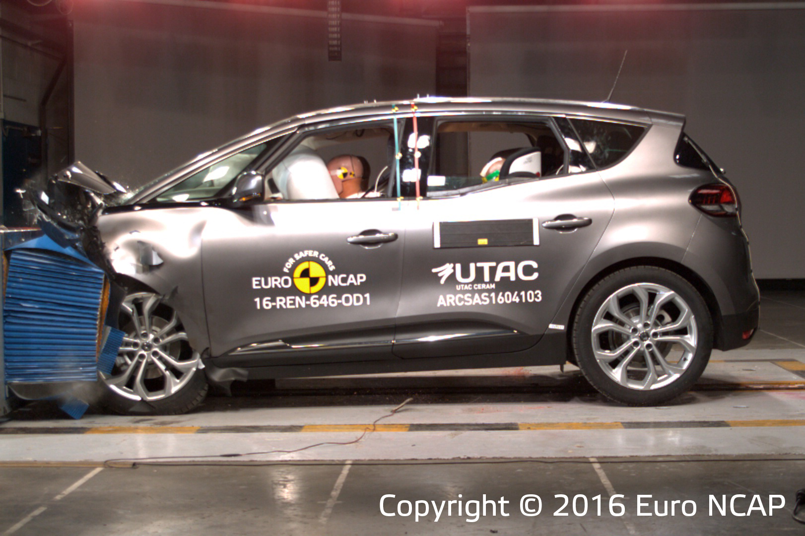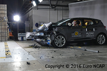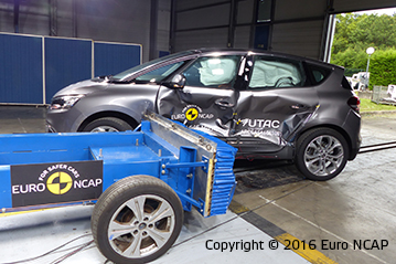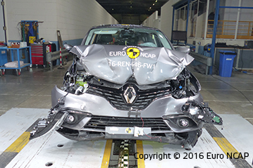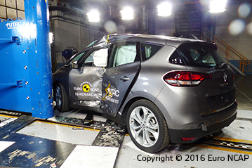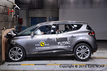 Przedział pasażerski pozostał stabilny w testach zderzenia czołowego. Odczyty z manekinów wykazały dobrą ochronę kolan i ud kierowcy i pasażera. Scenic pokazał, że podobny poziom ochrony będzie zapewniony dla pasażerów o różnych rozmiarach oraz siedzących na różnych miejscach. W próbie na pełnej szerokości sztywnej bariery ochrona kierowcy była dobra, poza ochroną szyi, którą bazując na odczytach z manekinów została oceniona jako bardzo słaba. Renault informowało, że chwilami wysokie ugięcia widoczne podczas testu były poza przewidywaniami rezultatami, z tego powodu mają być wprowadzone modyfikacje zapewniające osiągnięcie zaprojektowanej wydajności. Ochrona klatki piersiowej pasażera tylnej kanapy została oceniona jako marginalna. W bocznym zderzeniu z barierą Scenic uzyskał maximum punktów z dobrą ochroną dla wszystkich krytycznych obszarów ciała. W trudniejszej próbie zderzenia bocznego z słupem Scenic zapewnił dobrą ochronę dla wszystkich obszarów ciała z wyjątkiem klatki piersiowej, której ochrona była wystarczająca. Testy pokazały, że ochrona kręgów szyjnych zapewniona przez przednie fotele oraz zagłówki była dobra w przypadku uderzenia w tył, także ocena geometryczna tylnych siedzeń wykazała dobrą ochronę. Zwiększoną ochronę kręgów szyjnych zapewnia autonomiczny system hamowania awaryjnego. System sprawdził się dobrze w testach przy niskich prędkościach typowych dla ruchu miejskiego gdzie często w zderzeniach dochodzi do urazów kręgów szyjnych.