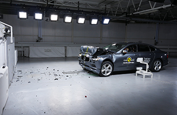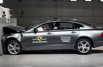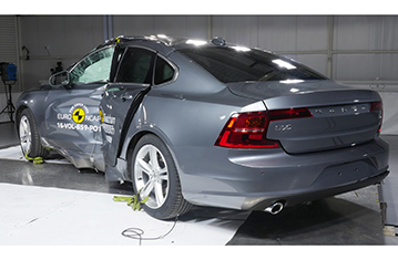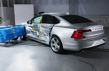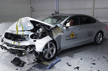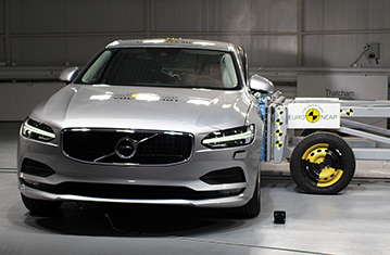 Volvo V90 to wersja kombi sedana S90. Euro NCAP zweryfikowało, że wyniki V90 są tak samo dobre lub lepsze jak S90. Zatem, prezentowana klasyfikacja jest oparta na ocenie Volvo S90. Przedział pasażerski pozostał stabilny w testach zderzenia czołowego z odkształcalną barierą. Odczyty z manekinów wykazały dobrą ochronę kolan i ud kierowcy oraz pasażera. Volvo pokazało, że podobny poziom ochrony będzie zapewniony dla pasażerów o różnych rozmiarach , siedzących na różnych miejscach. W próbie na pełnej szerokości sztywnej bariery ochrona kierowcy była prawie całkowicie dobra. Ochrona klatki piersiowej pasażera siedzącego z tyłu była marginalna, ale dla pozostałych obszarów ciała była dobra lub wystarczająca. W bocznym zderzeniu z barierą, samochód zapewnił dobrą ochronę dla wszystkich krytycznych obszarów ciała i zdobył maksymalną ilość punktów. Nawet w bardziej wymagającej próbie zderzenia bocznego z słupem, ochrona klatki piersiowej była wystarczająca, a pozostałych obszarów ciała dobra. Testy przednich foteli oraz zagłówków pokazały dobrą ochronę przeciwko urazom kręgosłupa szyjnego w przypadku uderzenia w tył pojazdu. Geometryczna ocena tylnich siedzeń, wskazała również dobrą ochronę przeciwko urazom kręgosłupa szyjnego. Dodatkowa ochrona kręgosłupa szyjnego jest zapewniona przez "City Safety", autonomiczny system hamowania awaryjnego. W testach jego działania przy niskich prędkościach, typowych dla ruchu miejskiego, system zdobył maksymalną ilość punktów, unikając kolizji przy wszystkich sprawdzanych prędkościach.