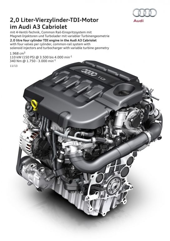 Kiedyś uważany był za świętokradztwo, ale dziś diesel pod maską kabrioletu nikogo już nie dziwi. Wysokoprężną jednostkę można znaleźć także w otwartej wersji Audi A3 III. Silnik o słynnym oznaczeniu 2.0 TDI rozwija 150 KM mocy i współpracuje z 6-stopniową manualną skrzynią biegów. Na razie nie wiemy, jakimi osiągami może pochwalić się ten model, wiemy z kolei, że auto składa dach w czasie 18 sekund.