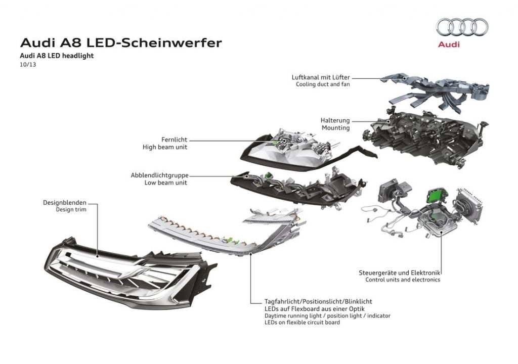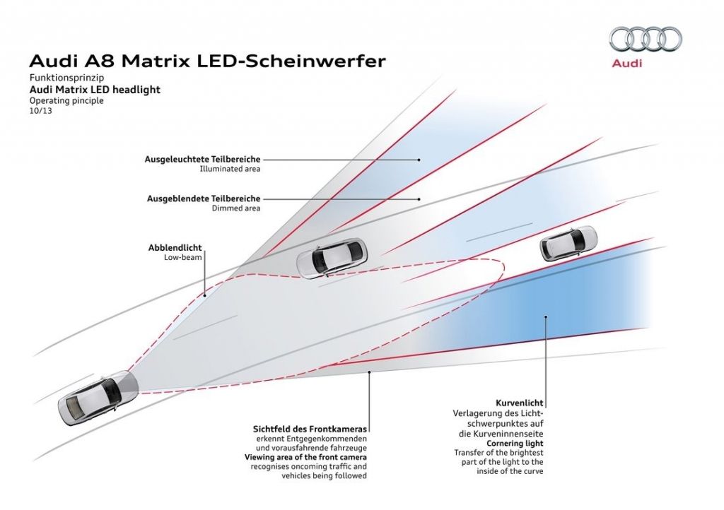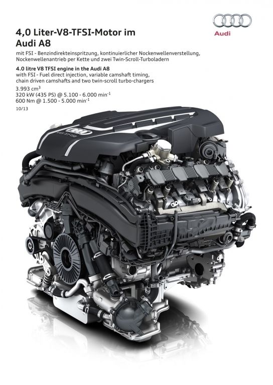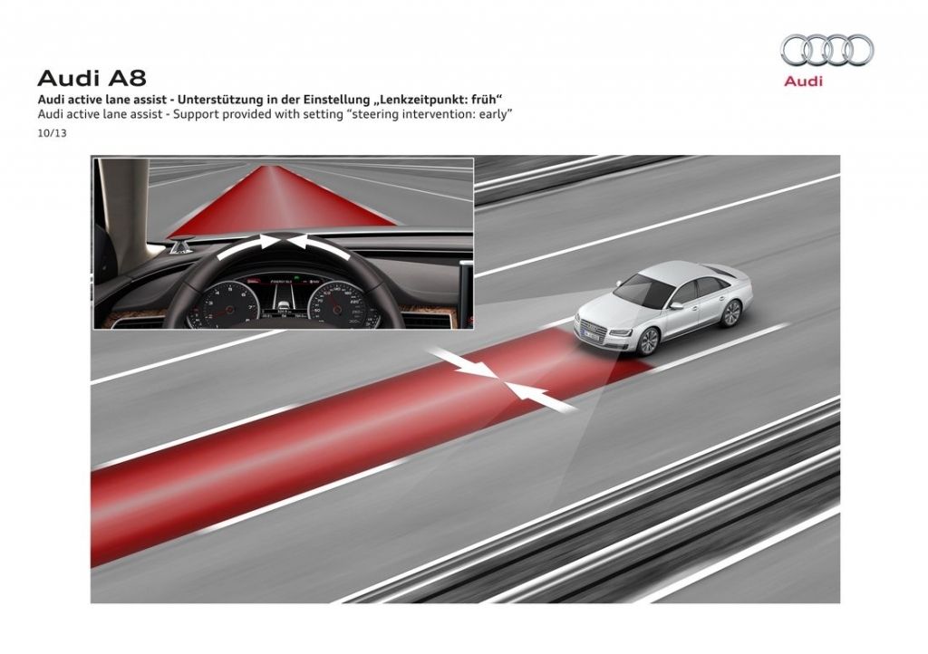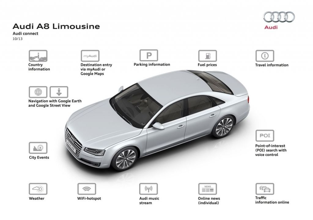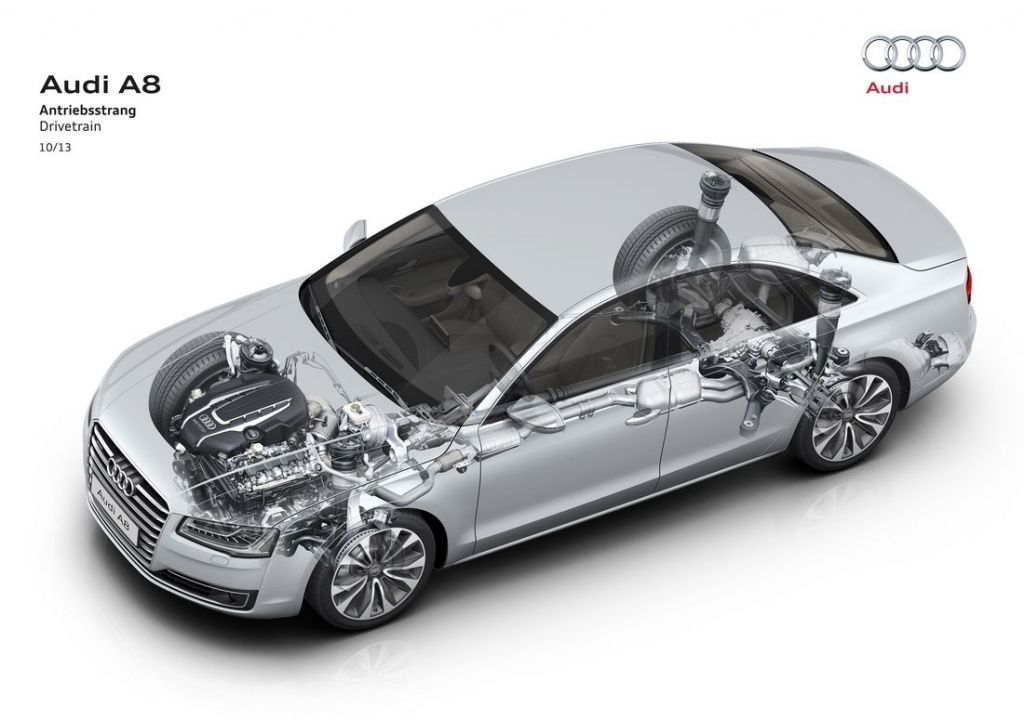 2013 rok przyniósł flagowej limuzynie Audi kurację odświeżającą. Główną zmianą wprowadzoną w jej ramach okazują się całkowicie nowe reflektory, które za sprawą technologii Matrix LED potrafią automatycznie dostosować się do warunków drogowych, włączając lub wyłączając poszczególne diody. Poza nowymi światłami, A8 D4 po liftingu dostało przeformowane zderzaki oraz zmienioną paletę wyposażenia.