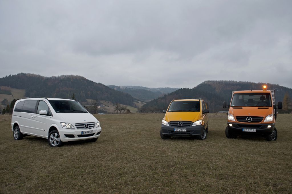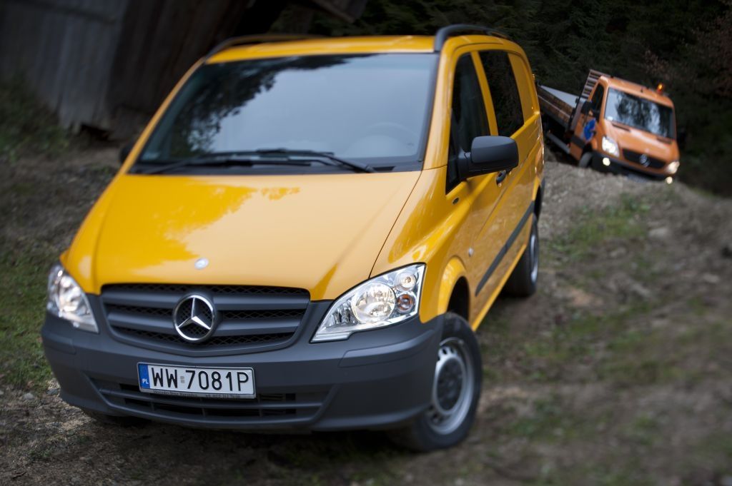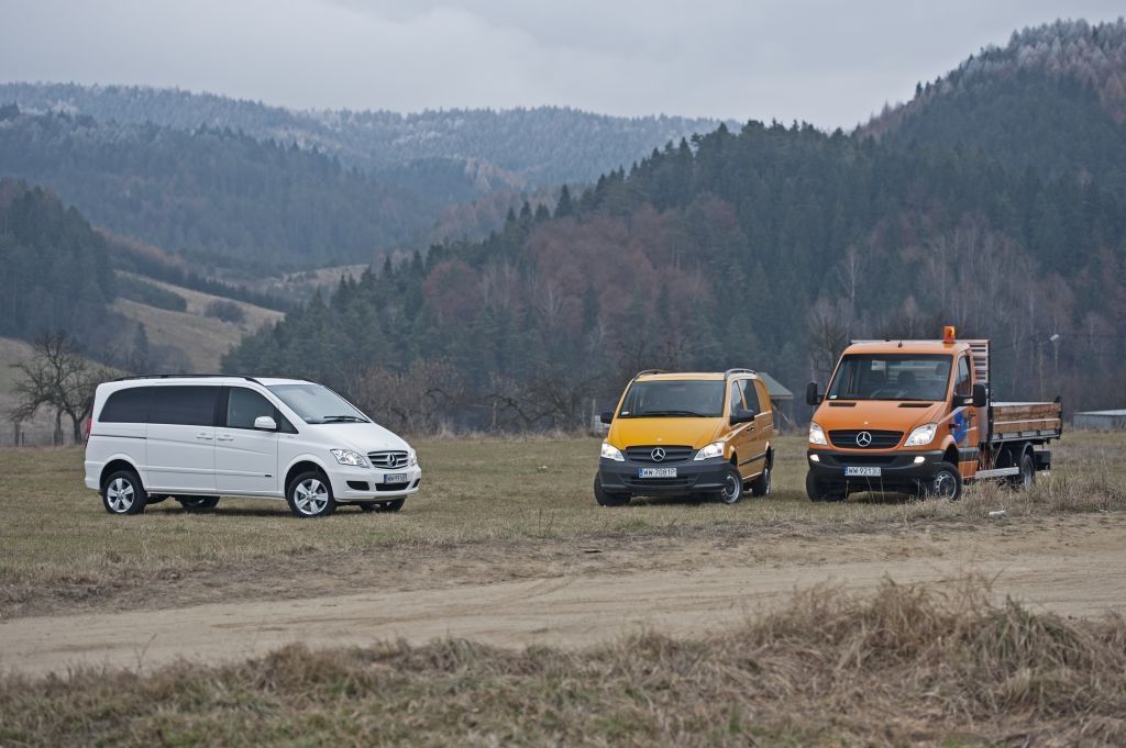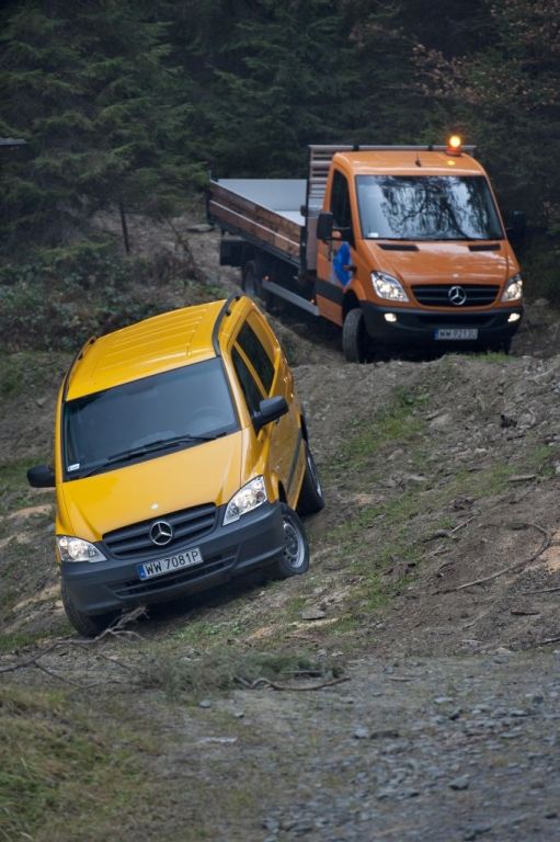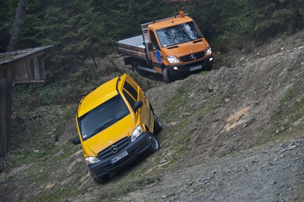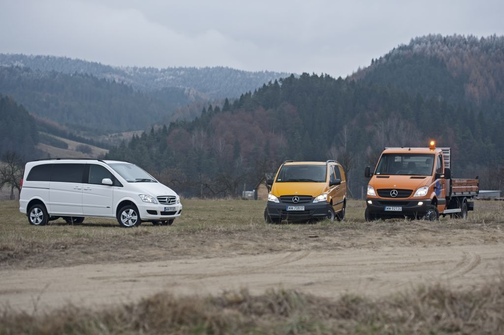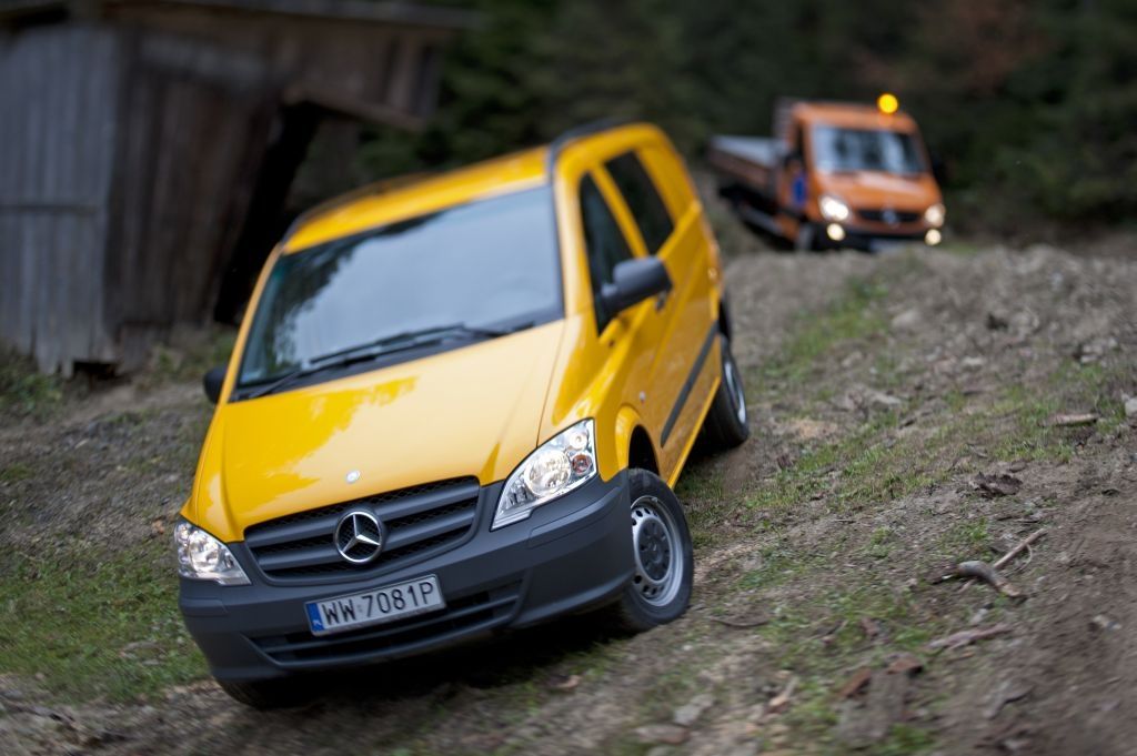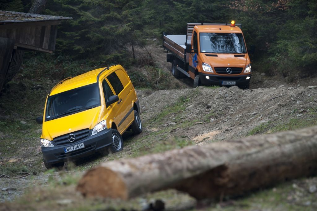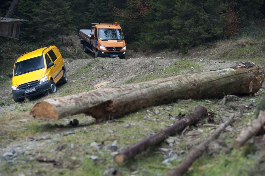 Kiedy trzeba przewieźć coś naprawdę dużego, a droga wiedzie przez wertepy "osobówka" z napędem jednej osi może nie wystarczyć. W takiej sytuacji z pomocą przychodzą "dostawczaki" wyposażone w napęd na wszystkie koła - takie jak np. prezentowane na zdjęciach Mercedesy. Fotografie w wykonano podczas oficjalnej prezentacji aut zorganizowanej w Krynicy-Zdroju.