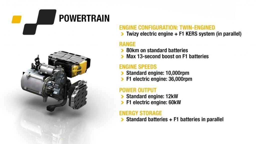 Choć wygląda jak primaaprilisowy żart, koncepcyjny Twizy RS F1 jest zwiastunem technologii, jaka znaleźć się ma w przyszłych, seryjnych modelach Renault. Mowa o systemie KERS - na wzór bolidów F1, Twizy został wyposażony w system odzyskujący energię z hamowania, gromadzący ją w bateriach i przekazujący na koła w postaci dodatkowego momentu napędowego. KERS podnosi masę auta o 91 kg, ale dostarcza, i to w sposób ciągły, dodatkowe 79 KM, podnosząc łączną moc do 96 koni.