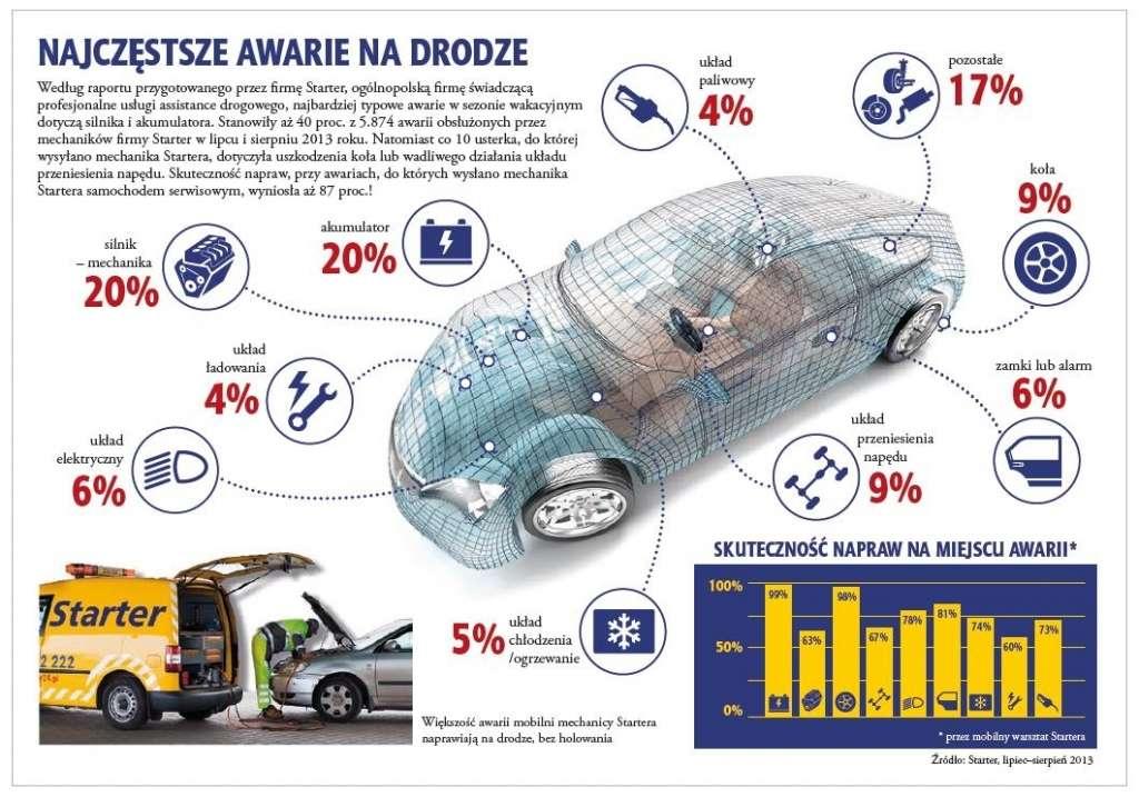 Jak podaje raport firmy Starter, w przypadku awarii silnika, najbardziej powszechne były usterki mechaniczne (79 proc.), awarie układu smarowania (5 proc.), usterki układu doładowania (4 proc.) i pomniejsze awarie - 11 proc. 98 proc. problemów z akumulatorem wiązało się z jego wyładowaniem. Natomiast uszkodzenia kół najczęściej stanowiły przebicia opon (97 proc.), a także problemy z ich wymianą. To one zmuszały kierowców do korzystania z pomocy assistance.