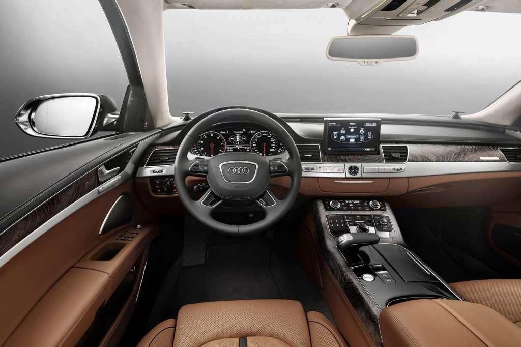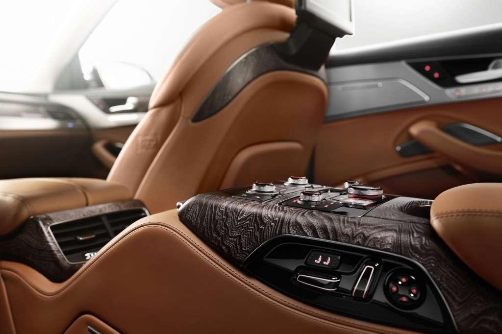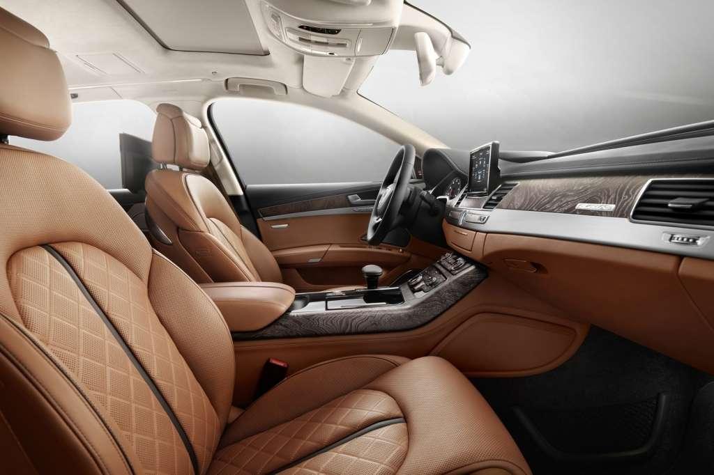 "Audi A8 W12 Exclusive ma wyjątkowo wytworne wnętrze. Wykorzystano w nim skórę anilinową w kolorze Agatha cognac, dostarczaną przez Poltrona Frau - firmę meblarską o bogatej tradycji. Skóra ta charakteryzuje się szczególną miękkością i naturalnym wyglądem. Centralną część siedzeń zdobi stebnowanie o kształcie diamentów. Inkrustacje wykonano z drewna oliwkowego w naturalnym szaro-brązowym kolorze. Ich odcień harmonizuje z granitowo-szarymi lamówkami, szwami i elementami dekoracyjnymi siedzeń. Ten sam granitowo-szary odcień widoczny jest na pokrytej skórą Fainnappa kierownicy, na tapicerce górnej części drzwi oraz na górnej części deski rozdzielczej. Podsufitkę wykonano ze śnieżnobiałego materiału Alcantara. Tylna półka została pokryta tym samym materiałem w kolorze koniakowym. Dywaniki są szare."