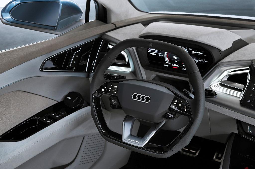 Koncepcyjne Audi Q4 e-tron mierzy 4,59 m długości, 1,90 m szerokości i 1,61 m wysokości, jednak dzięki rozstawowi osi wynoszącemu 2,77 m kabina zapewnia całkiem sporo miejsca. Komfort podróży zapewniają cztery wygodne fotele z zintegrowanymi zagłówkami i wykończone alcantarą. Kierowca przed oczami ma wirtualny kokpit z najważniejszymi informacjami - poza prędkością i innymi podstawowymi parametrami, kierowca widzi również m.in. poziom naładowania baterii, a także wskazania systemu nawigacji, wykorzystujące funkcję rzeczywistości rozszerzonej. Na konsoli środkowej znajduje się zaś 12,3-calowy ekran dotykowy, za pomocą którego obsługiwane są funkcje systemu informatyczno-rozrywkowego.