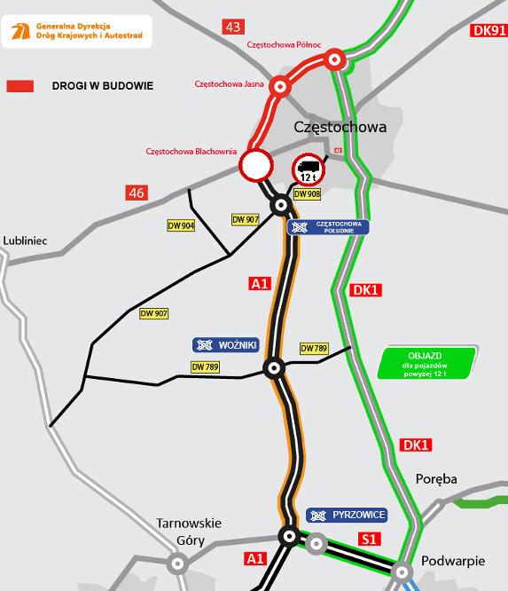 Warto mieć na uwadze, że na razie kierowcy pojazdów o masie całkowitej powyżej 12 ton, jadący od Pyrzowic na północ, będą mogli na węźle Częstochowa Południe zjechać tylko w kierunku zachodnim na Konopiska. W kierunku wschodnim na miejskim odcinku drogi wojewódzkiej DW908 będzie obowiązywał zakaz wjazdu dla pojazdów powyżej 12 t. Dlatego też dla tych pojazdów wprowadzony został objazd od węzła Pyrzowice przez drogę S1 do węzła Podwarpie i dalej DK1 na północ. Zakaz nie będzie dotyczył jedynie pojazdów służb miejskich i zaopatrzenia.