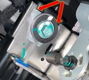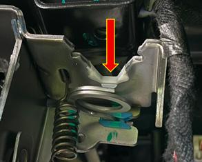 Górne mocowanie kolumny kierowniczej w sprawnym samochodzie oraz po wyrwaniu elementu przykręcanego do wzmocnienia deski rozdzielczej, zobrazowano na załączonych zdjęciach (ZDJĘCIE 1 i ZDJĘCIE 2). Jak widać, trapezowy klocek ze stopu lekkiego jest wsunięty w blaszaną obejmę mechanizmu regulacji oraz zablokowany w swej pozycji za pomocą wtrysku plastiku. Strzałką zaznaczono odpowiednio: miejsce wtrysku plastiku pomiędzy elementami mocowania w sprawnym samochodzie (ZDJĘCIE 1) oraz pozostałości plastiku spajającego oba elementy mocowania po wyrwaniu elementu przykręcanego do wzmocnienia deski rozdzielczej (ZDJĘCIE 2).