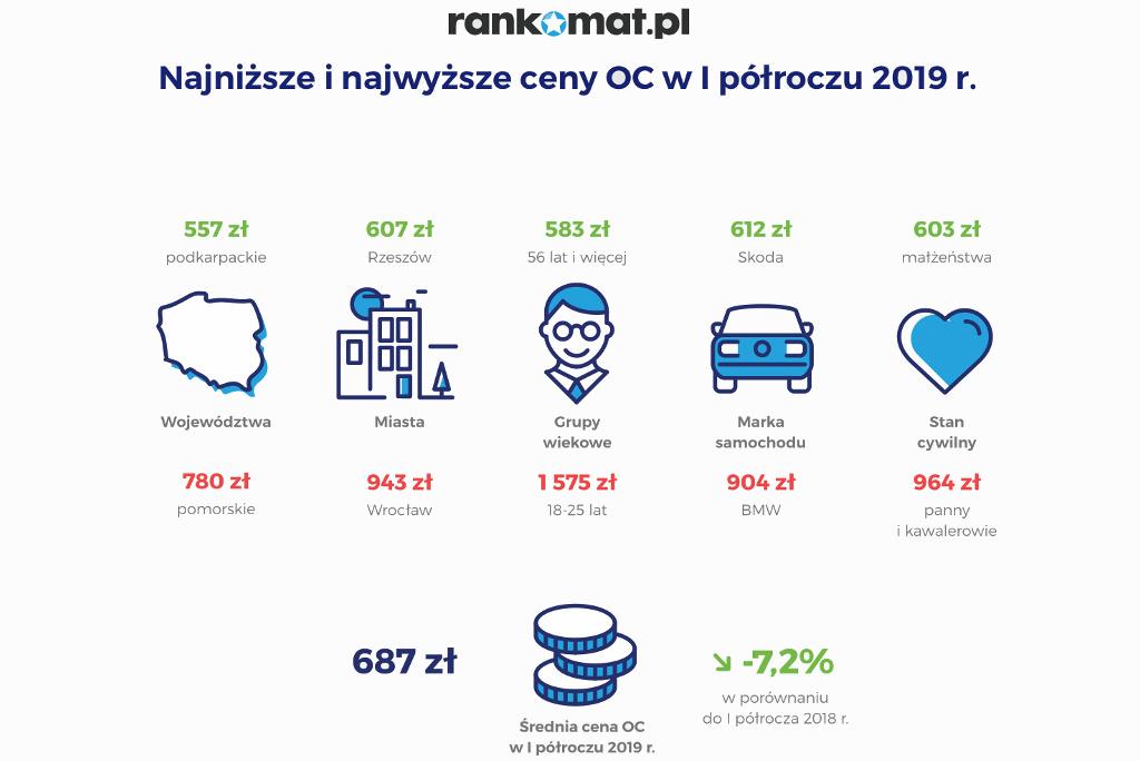 Najmniej za polisę OC w pierwszym półroczu 2019 r. (wśród klientów rankomat.pl) zapłacił urodzony w 1977 r. mieszkaniec województwa podkarpackiego, korzystający z 60-proc. zniżki. Za swoją Dacię Sandero z 2014 r. z benzynowym silnikiem o pojemności 898 cm3 zapłacił 250 zł.