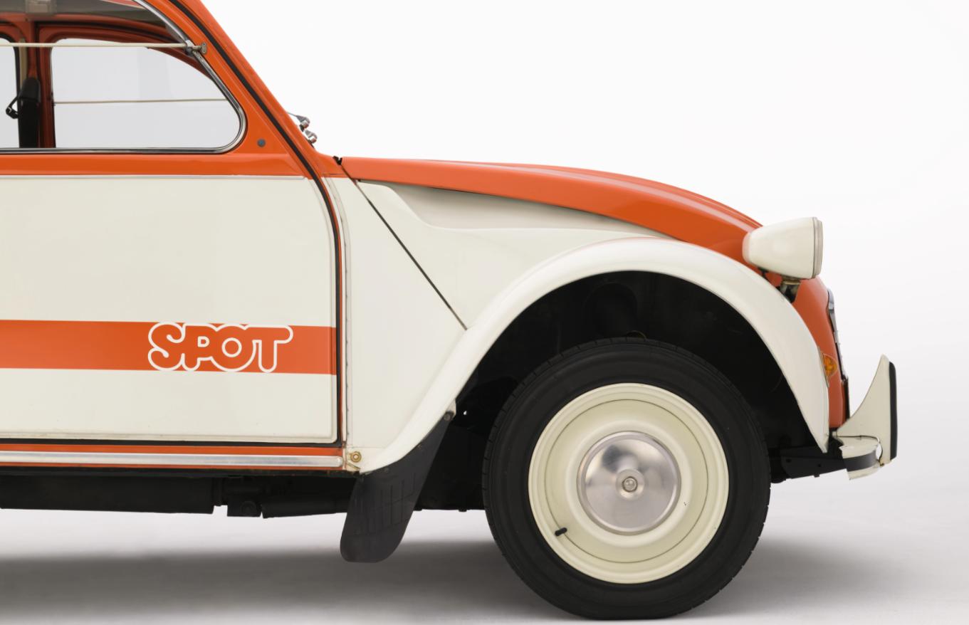Historia 2CV Spot rozpoczęła się w 1974 roku w pracowni Serge’a Gevina, który przedstawił Citroënowi dwa wyraźnie odmienne kierunki stylistyczne. Jeden bazował na ciemnych, sportowych kontrastach, drugi na radosnym, letnim pomyśle: pomarańczowe nadwozie z białymi skrzydłami, miękki dach i panele drzwi w pomarańczowo-białe pasy jak daszki leżaków plażowych.