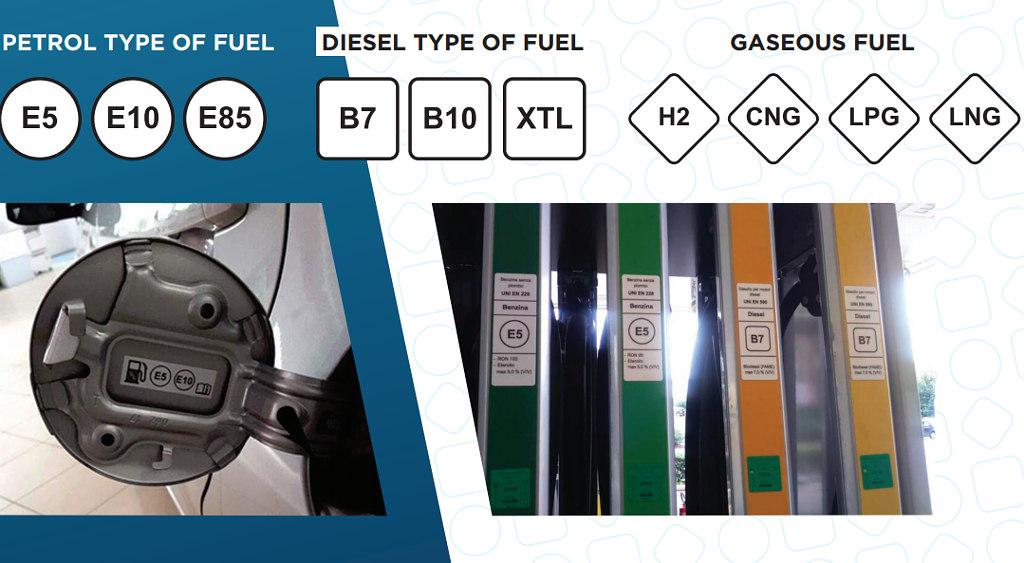 Etykiety będą musiały być widoczne również na dystrybutorach paliw, w tym także na pistoletach. Będą one identyczne jak etykiety, które znajdą się na samochodach oraz w instrukcjach obsługi, choć mogą mieć inne rozmiary. Na dystrybutorach mogą pojawić się dodatkowe oznaczenia i informacje zgodne z wymogami krajowymi oraz w miejscowym języku.