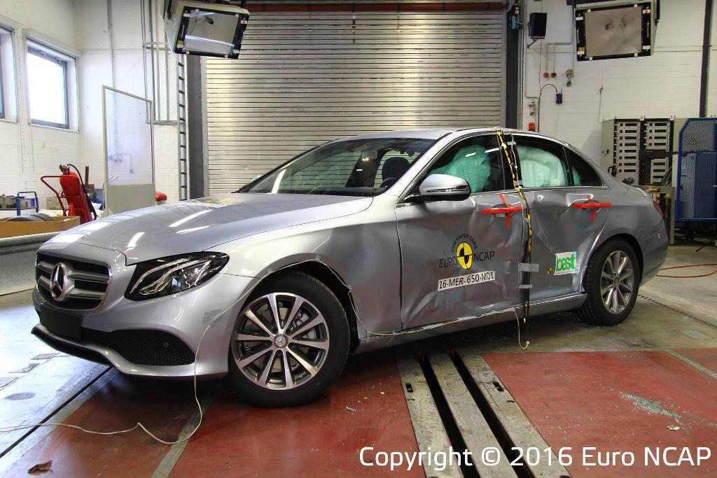 Mercedes Klasy E uzyskał bardzo dobry wynik w kategorii ochrony dorosłych pasażerów. Rezultat 95% możliwych punktów do uzyskania stawia go wśród najbezpieczniejszych modeli poddanych testom zderzeniowym przez Euro NCAP. Również w kategorii bezpieczeństwa dzieci, w której limuzyna Mercedesa uzyskała 90%, E-klasa należy do najbezpieczniejszych modeli. Ponadto model ten uzyskła 77% punktów za ochronę pieszych oraz 62% za posiadane systemy zwiększające bezpieczeństwo kierowcy i pasażerów. Wśród ocenionego wyposażenia znalazł się m.in. system aktywnego układu hamulcowego, który w ruchu miejskim potrafi np. uchronić przez kolizją.