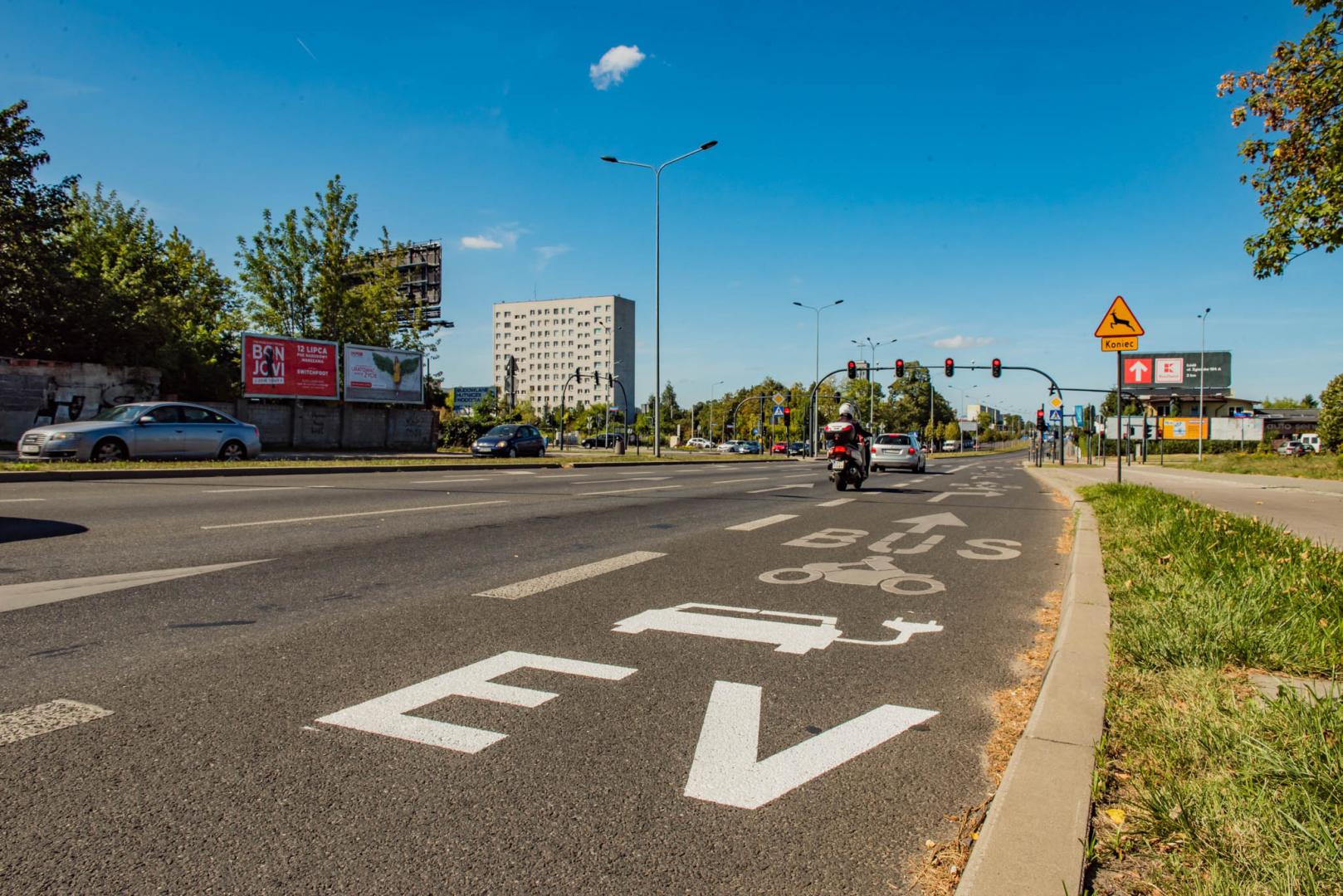 Dziś w Łodzi na pierwszych ulicach naniesione zostało oznakowanie poziome buspasów, które zawiera piktogram samochodu elektrycznego i skrót EV.