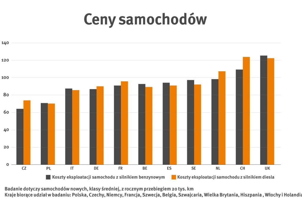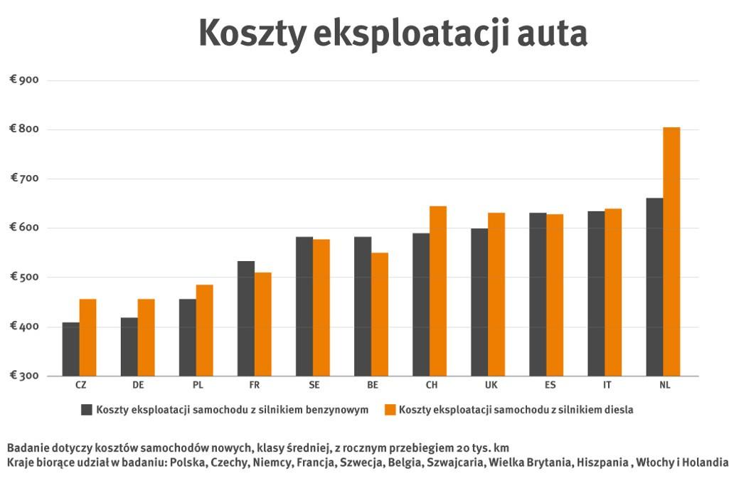 Na drugim końcu tej listy znalazły się Czechy, gdzie miesięczny koszt utrzymania auta z silnikiem benzynowym wynosi 406 euro, a z dieslem 455 euro. W Polsce średni miesięczny koszt auta łącznie z paliwem to dla silnika benzynowego 450 euro, dla diesla 480 euro. Zaskakująco niski koszt posiadania samochodu mają Niemcy - odpowiednio 418 euro i 454 euro.