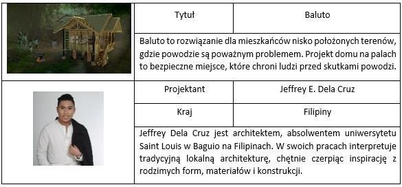 - Baluto, autor: Jeffrey E. Dela Cruz (Filipiny). Modułowy system budowy domów, zaprojektowany, by przetrwać trzęsienia ziemi i silne powodzie.