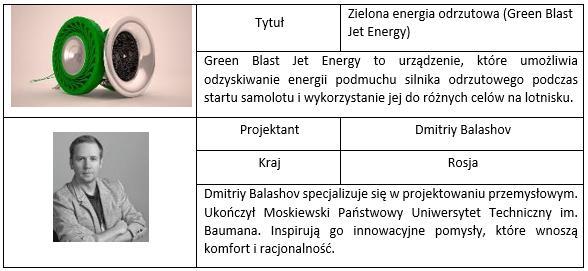 - Zielona energia odrzutowa (Green Blast Jet Energy), autor: Dmitriy Balashov (Rosja). Turbina odzyskująca energię z podmuchu silnika odrzutowego podczas startu samolotu.