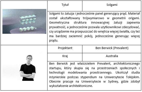 - Solgami, autor: Ben Berwick, startup Prevalent (Australia). Rolety okienne, które produkują prąd i umożliwiają regulację stopnia oświetlenia wnętrza.