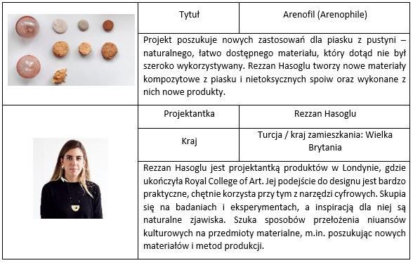 - Arenofil (Arenophile), autorka: Rezzan Hasoglu (Turcja / UK). Projekt odkrywa możliwości nowych materiałów do tworzenia produktów, powstałych z połączenia piasku z pustyni z różnymi substancjami wiążącymi.