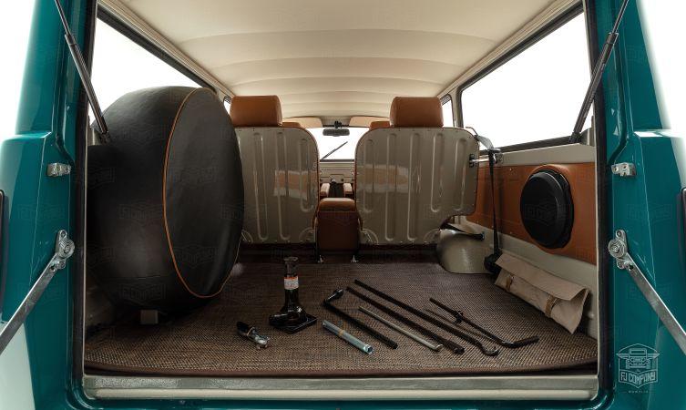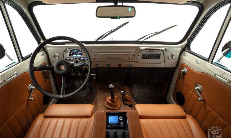Wnętrze wykończono w prostym stylu retro, ale nie zabrakło w nim nowoczesnych udogodnień, takich jak klimatyzacja czy mocny system audio. Najważniejsze funkcje są kontrolowane robionymi na zamówienie przełącznikami, a na tablicy rozdzielczej nie znajdziemy ani grama nowoczesności. Przednie siedzenia zostały wymienione na wygodne fotele pokryte brązową, winylową tapicerką.