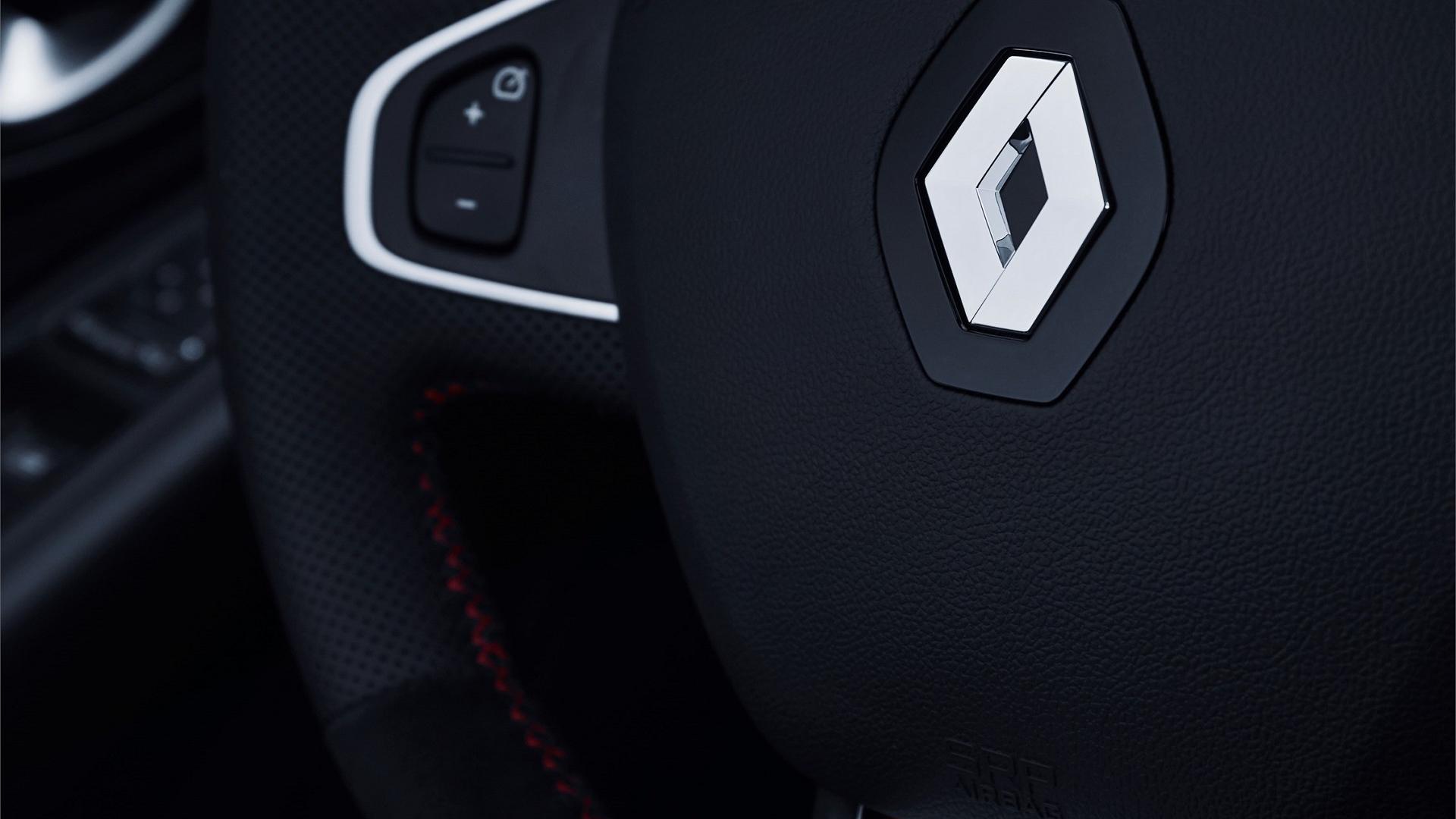 WEWNĄTRZ: wyjątkowy charakter tej limitowanej serii jest widoczny już w chwili wsiadania w postaci numerowanych i opatrzonych znakiem „R.S.” nakładek na progi drzwi. Składa się na niego również obszyta Alcantarą® i skórą kierownica, wizualnie podkreślająca sportowy charakter samochodu. Nawiewy na desce rozdzielczej posiadają obramowanie z karbonowym motywem. Ponadto wersja ta posiada w standardzie firmowe dywaniki podłogowe Renault Sport.