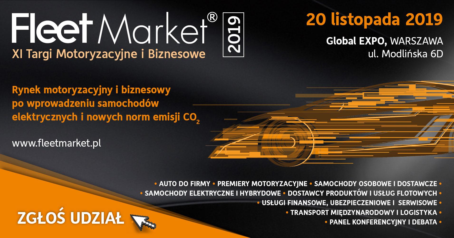 Ogólnopolskie Targi Motoryzacyjne i Biznesowe Fleet Market odbędą się już 20 listopada br. w hali Global EXPO w Warszawie. 11. edycja targów, organizowana jest z myślą o przedsiębiorcach, osobach odpowiedzialnych za politykę samochodową w firmach oraz o wszystkich, którzy są obecnymi lub potencjalnymi nabywcami samochodów firmowych i usług flotowych.