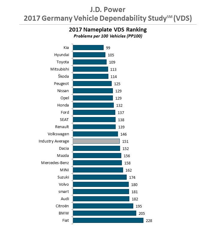 Ciekawostką są niskie pozycje niemieckich marek w tym zestawieniu. Na ósmej pozycji sklasyfikowany został Opel (129 PP100), zaś na 13. Volkswagen (146 PP100). Równie kiepsko wypadły w tym badaniu niemieckie marki segmentu premium. Najlepszą okazał się Mercedes (16. miejsce) z wynikiem 158 PP100. 21. miejsce zajęło Audi (182 PP100), a 23. BMW (205 PP100). Za bawarską marką znalazł się tylko jeszcze Fiat z wynikiem 228 PP100.