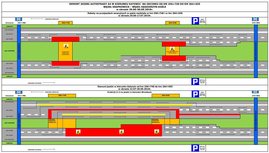 Mniej więcej w drugiej połowie lipca rozpocznie się właściwy remont i nastąpi zamknięcie południowej jezdni autostrady (w kierunku do Katowic). Roboty na jezdni południowej będą prowadzone w jednym etapie całą szerokością jezdni, a ruch zostanie przełożony na jezdnię północną, tj. w kierunku do Wrocławia.