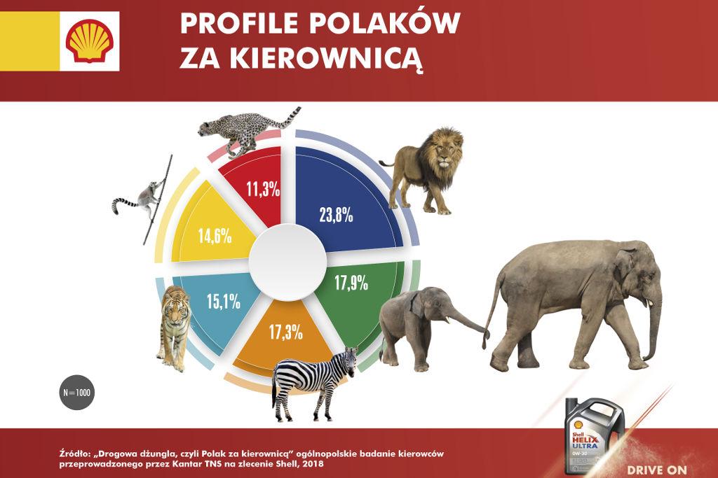 Zgodnie z wynikami badania Shell "Drogowa dżungla, czyli Polak za kierownicą" statystyczny kierowca w Polsce ma 40 lat, jest mężczyzną (7 na 10 respondentów), z wykształceniem średnim bądź wyższym, ma jedno dziecko oraz jeden samochód. Na podstawie wyników badania wyłoniono sześć najczęściej spotykanych typów kierowców, którzy różnią się upodobaniami, poziomem empatii, temperamentem, nawykami i stylem jazdy. Otrzymane typy doskonale oddają charakter i zachowania zwierząt z afrykańskiej dżungli.