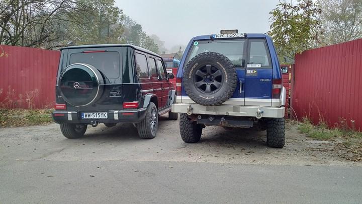Bardziej doświadczony terenowo kolega Isuzu, po lekkich modyfikacjach, wmawia G-klasie, że jednak w ciężkim terenie nie pomogą żadne tablety przed kierowcą, niemniej topowy zestaw audio może być przydatny, kiedy będziemy głośno wołać o pomoc. Sarkazm czy prawda? Co sądzicie?
