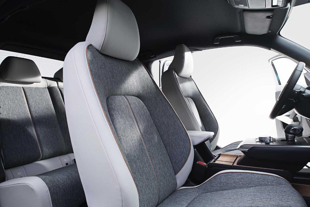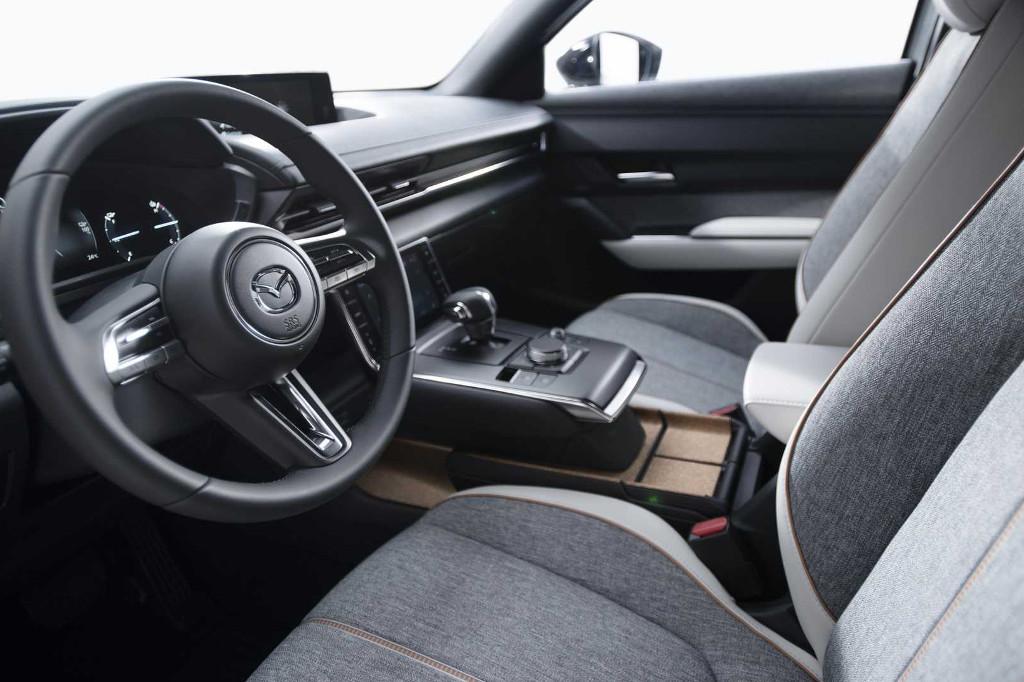 Ekologiczne cechy zapewnia nie tylko napęd Mazdy MX-30, ale również wykończenie wnętrza, w którym wykorzystano szereg przyjaznych dla środowiska naturalnego materiałów. W uchwytach w centralnym tunelu pomiędzy fotelami znajdziemy podkładki wykonane z korka, które zostały pozyskane z drzew bez konieczności ich ścinania. Tapicerka drzwi wykorzystuje włókna pochodzące z poddanego recyklingowi plastiku. Również obicia foteli pochodzą z przetworzonych materiałów.
