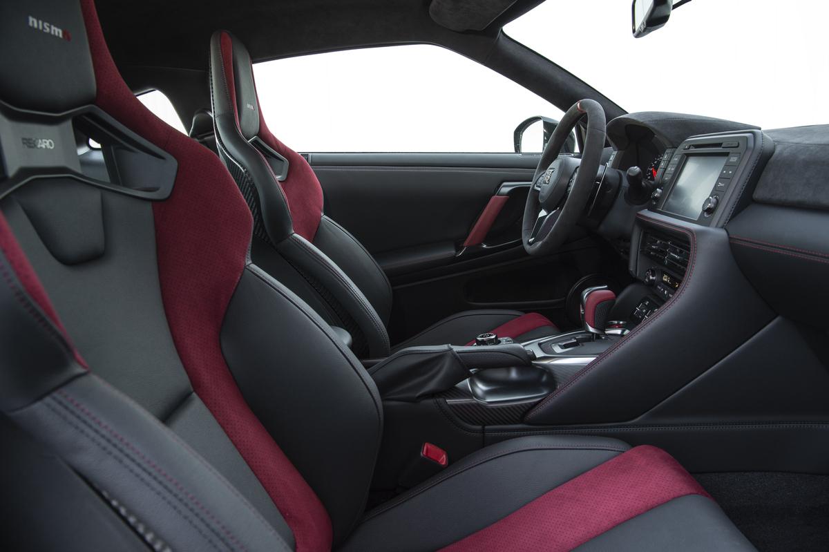 W kabinie mamy zaprojektowane przez firmę Recaro przednie fotele GT‑R Nismo, które w wersji na 2020 r. zostały ulepszone poprzez zastosowanie trzywarstwowej struktury, w której dwie warstwy włókna węglowego są przedzielone główną sekcją w sposób zapewniający lepsze podparcie górnej części ciała. Uzupełnienie włókna węglowego wewnętrznym stelażem poprawiło sztywność skrętną foteli (o ok. 20%), a mimo to udało się zmniejszyć ich masę o 1,4 kg.