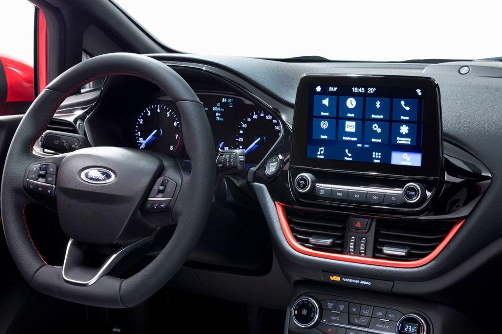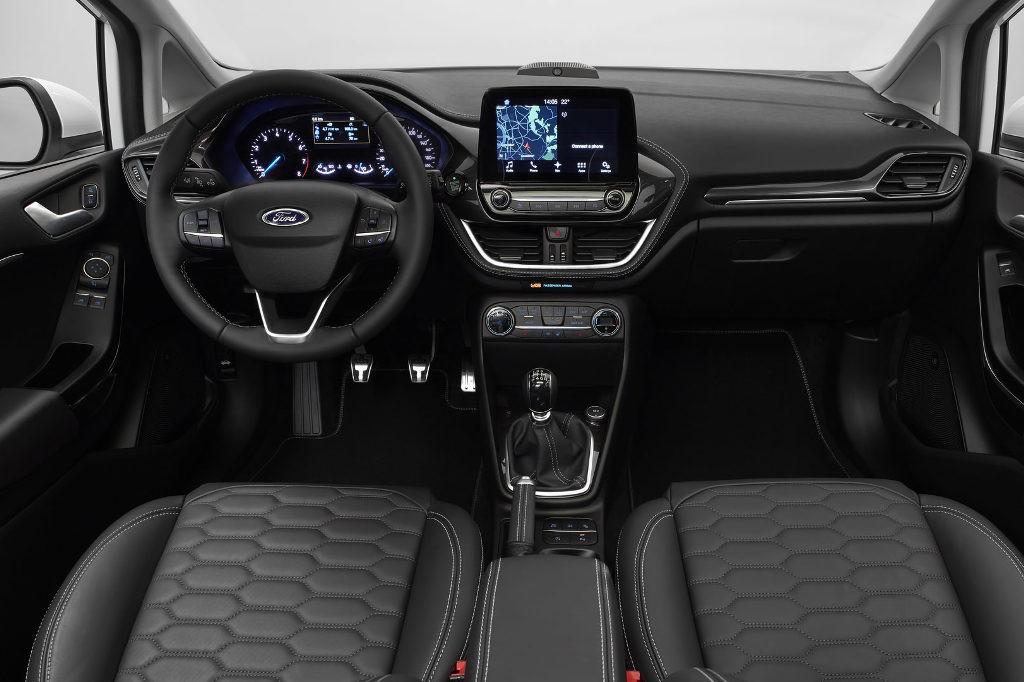 Pierwsze zdjęcia wnętrza nowej Fiesty zdradzają użycie lepszej jakości materiałów wykończeniowych i generalnie widać atrakcyjniejsze wykończenie kabiny. Centralny punkt wnętrza stanowi nowy, 8-calowy ekran dotykowy układu multimedialnego SYNC 3, który m.in. reaguje na ruchy ręką.