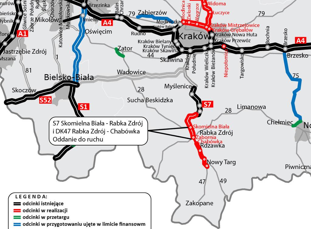 Od wczoraj kierowcy mogą korzystać z ostatniego z wymienionych wyżej odcinków. Z ponad 6-kilometrowego odcinka od Skomielnej Białej do Chabówki ponad jedna trzecia, czyli ok. 2,3 km, poprowadzona została na wiaduktach. Powstało ich siedemnaście, w tym najdłuższy i najwyższy, liczący kilometr długości i 50 m wysokości. Z węzła Skomielna poprowadzono zjazdy na Wadowice i Nowy Sącz, do drogi krajowej nr 28 oraz do starego przebiegu DK7. Z kolejnego węzła, Zabornia, zjechać można na DK47 w kierunku Nowego Targu i Zakopanego oraz na DK7 do Chyżnego i granicy państwa ze Słowacją.