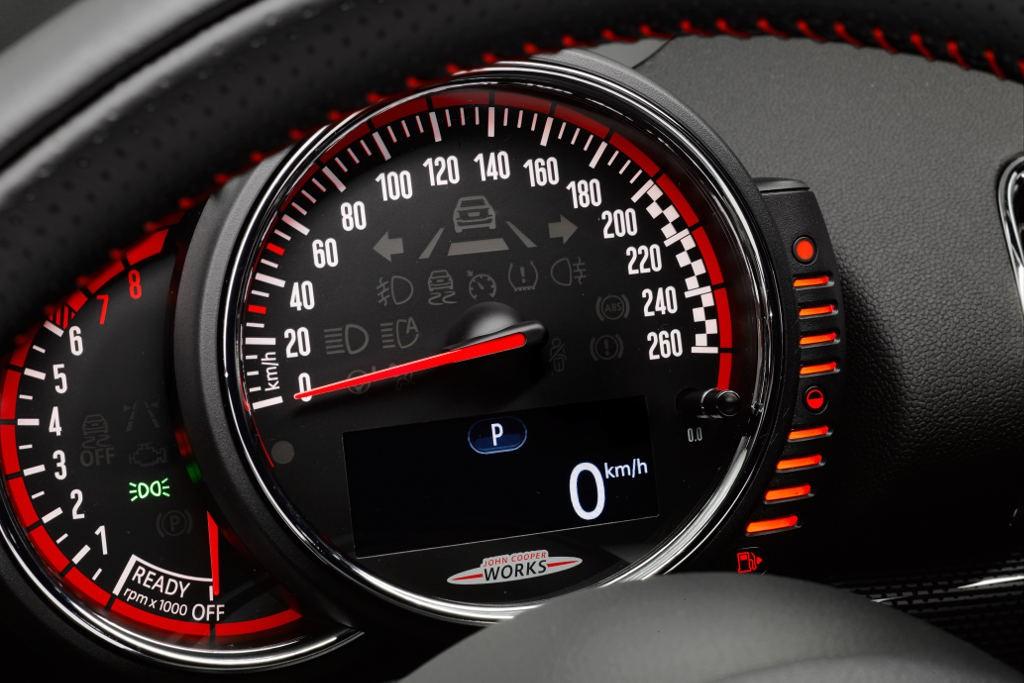 Z kolei w kabinie kierowca i przedni pasażer mogą się cieszyć z lepiej wyprofilowanych foteli z zintegrowanymi zagłówkami. Inne sportowe akcenty to aluminiowe nakładki na pedałach oraz skórzana kierownica typowa dla wersji JCW, a także czerwone wstawki na kierownicy, lewarku zmiany biegów i innych miejscach.