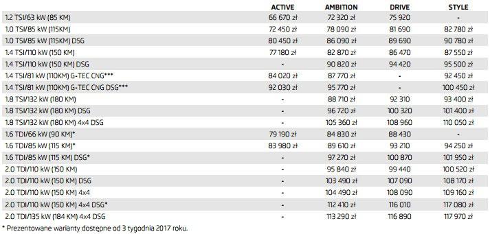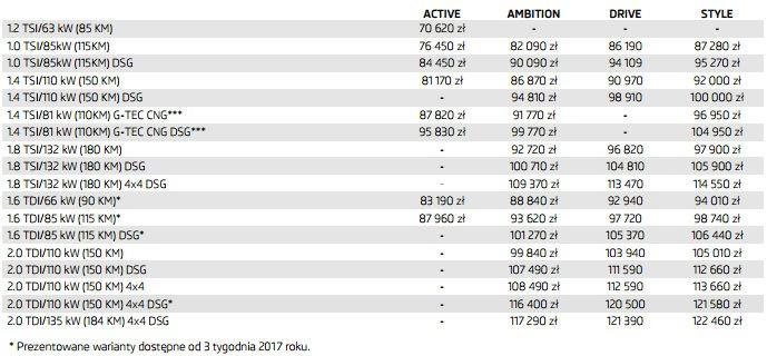 Ceny Octavii po liftingu zaczynają się od 66 670 zł za 85-konną wersję z silnikiem 1.2 TSI w wariancie Active. Za litrową wersję 1.0 TSI 115 KM trzeba zapłacić minimum 72 450 zł, zaś za 180-konną jednostkę TSI co najmniej 88 710 zł. Oferta jednostek wysokoprężnych rozpoczyna się od kwoty 79 190 zł (1.6 TDI 90 KM), a za najmocniejszego diesla trzeba będzie zapłacić 113 290 zł. Dopłata do wersji kombi jest różna w zależności od wersji wyposażenia i silnika, ale oscyluje w granicach 4 tys. zł. W porównaniu do ustępującej odmiany ceny odświeżonej wersji są wyższe od ok. 2,5 do 4 tys. zł.