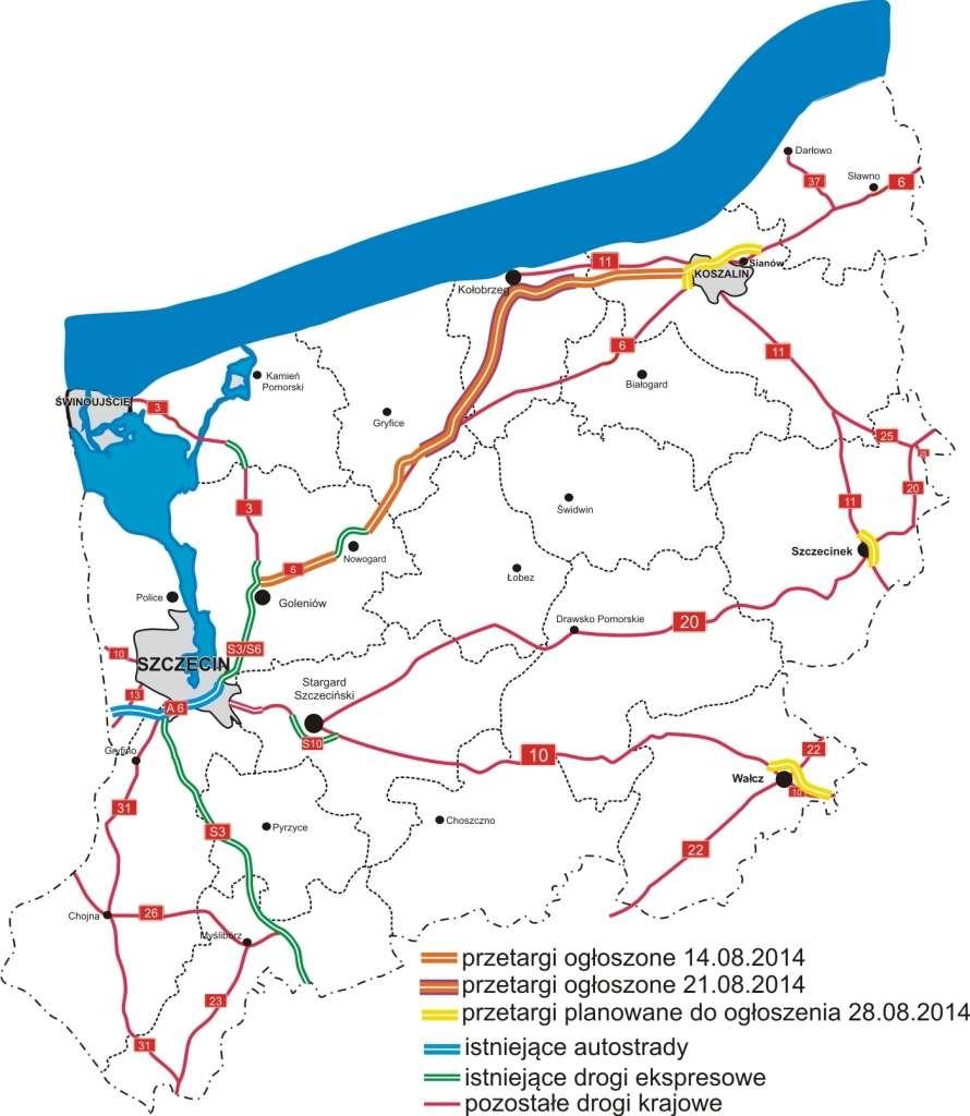 W połowie sierpnia doszło również do ogłoszenia przetargu na budowę 63 km drogi S6 od Goleniowa do początku obwodnicy Koszalina.