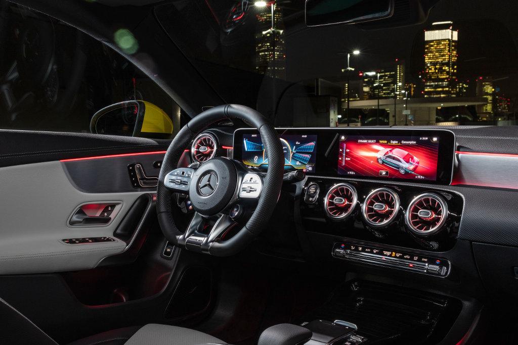 Po otwarciu drzwi z bezramkowymi oknami w oczy rzuca się system multimedialny MBUX z szerokim ekranem o przekątnej 10,25 cala, za pośrednictwem którego kierowca będzie mógł zarządzać większością instrumentów pokładowych. Cyfrowy panel z zegarami ma trzy tryby wyświetlania typowe dla modeli AMG: Classic, Sport i Supersport. W tym ostatnim centralnie umieszczony obrotomierz ma po obu bokach dodatkowe informacje m.in. wskaźnik siły przeciążenia czy różne parametry nt. pracy silnika.