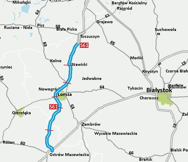 Budowa drogi ekspresowej S61 od obwodnicy Ostrowi Mazowieckiej do obwodnicy Szczuczyna zostanie podzielona na 6 odcinków, które zostaną zrealizowane w systemie "Projektuj i Buduj":