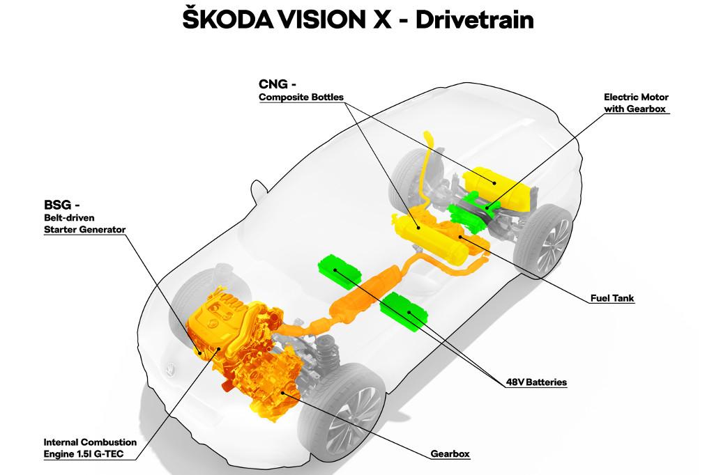 Silnikiem spalinowym w układzie hybrydowym Skody Vision X jest 1,5-litrowa jednostka TSI G-TEC, która została odpowiednio zmodyfikowana, by mogła być zasilana gazem CNG. W tym trybie maksymalna moc jednostki wynosi 130 KM, a jej maksymalny moment obrotowy wynosi 250 Nm. W aucie zamontowano dwa zbiorniki na sprężony gaz ziemny (CNG). Jeden znalazł się pod tylnymi siedzeniami, drugi za tylną osią. Napęd z tej jednostki trafia na koła przedniej osi, natomiast silnik elektryczny napędza tylną oś. Ponieważ Vision X jest klasyczną hybrydą, w trybie elektrycznym auto to będzie w stanie pokonać niewiele, zaledwie ok. 2 km. Jednostka elektryczna bardziej będzie pełnić funkcję pomocniczą podczas ruszania czy też przyspieszania.