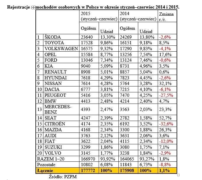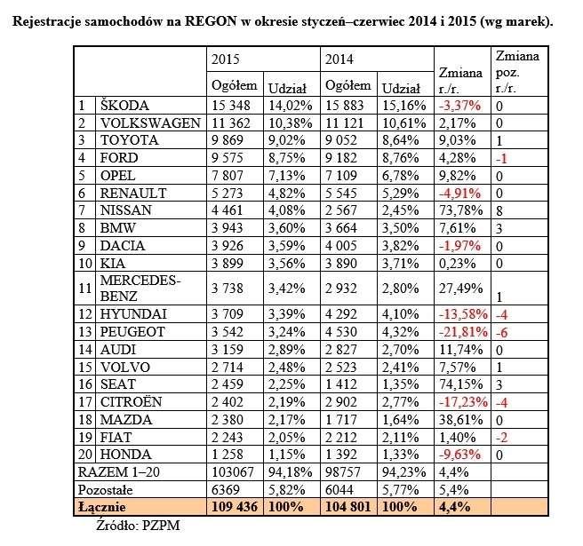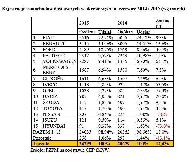 W pierwszym półroczu 2015 roku utrzymała się tendencja wzrostu zakupów samochodów w firmach oraz zmniejszania się zainteresowania nowymi pojazdami wśród klientów indywidualnych. Znakomite wyniki rejestracji zanotowano w segmencie pojazdów dostawczych.