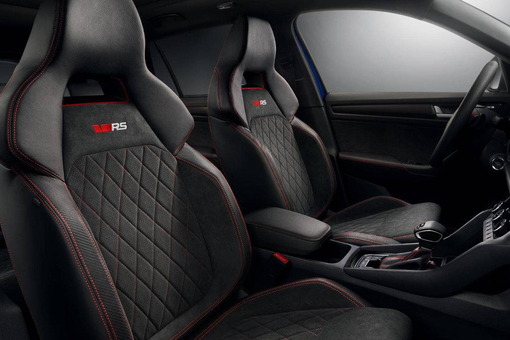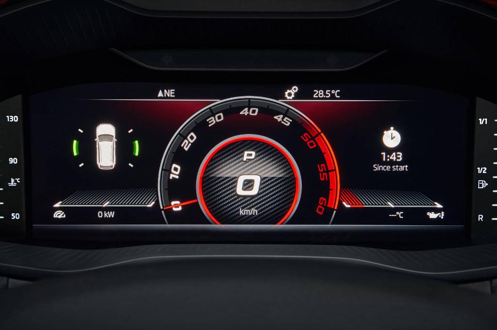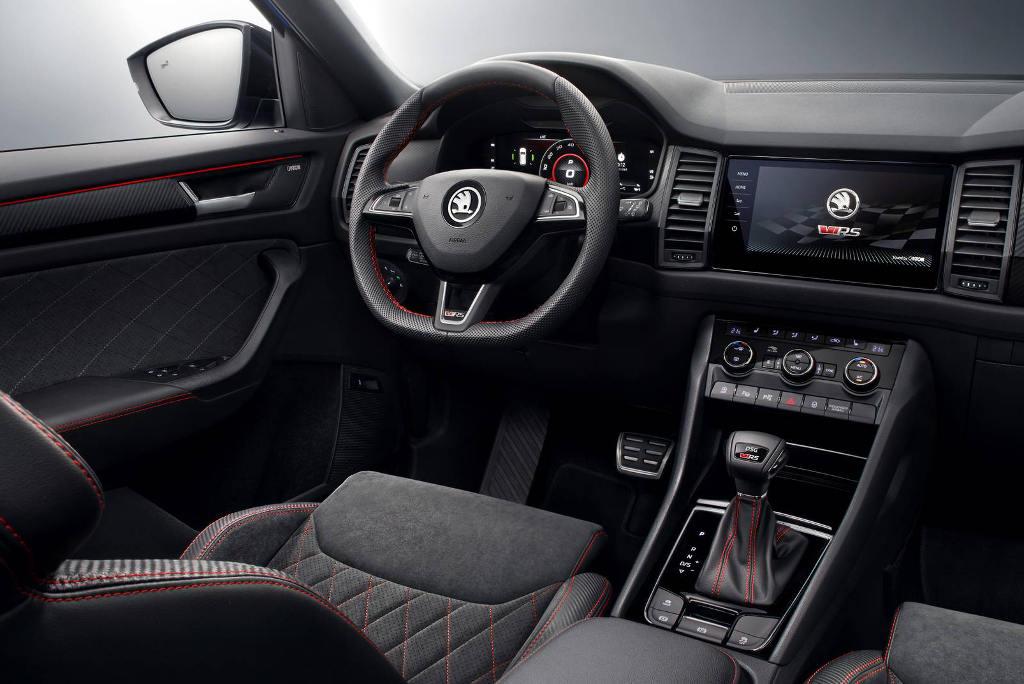 Jeśli zaś chodzi o wygląd Kodiaqa RS, to znajdziemy tu kilka wyróżników, poza logo RS, które pozwolą nam zidentyfikować ten wariant silnikowy na drodze. Kodiaq RS otrzymała w standardzie w pełni LED-owe reflektory z efektem krystalicznym. Do tego mamy 20-calowe felgi, a we wnętrzu wirtualny kokpit z trybem Sport, w którym w centralnym miejscu znalazł się obrotomierz i pojawiła się także m.in. funkcja mierzenia czasu przejazdu okrążenia.