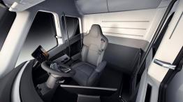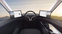 Stylistyka Tesli Semi może budzić pewne kontrowersje. Pamiętajmy jednak, że stworzono ją z myślą o jak najlepszych właściwościach aerodynamicznych. Z kolei kabina tej ciężarówki została zaprojektowana niezwykle minimalistycznie, i nie chodzi tu tylko o jeden, umieszczony centralnie fotel. Poza kierownicą znajdziemy tam jeszcze tylko dwa duże ekrany po obu jej stronach. Z jednej strony dostarczają one wszystkich niezbędnych informacji, jak i zapewniają obsługę wszystkich urządzeń pokładowych, z drugiej zastępują przy okazji boczne lusterka zewnętrzne.