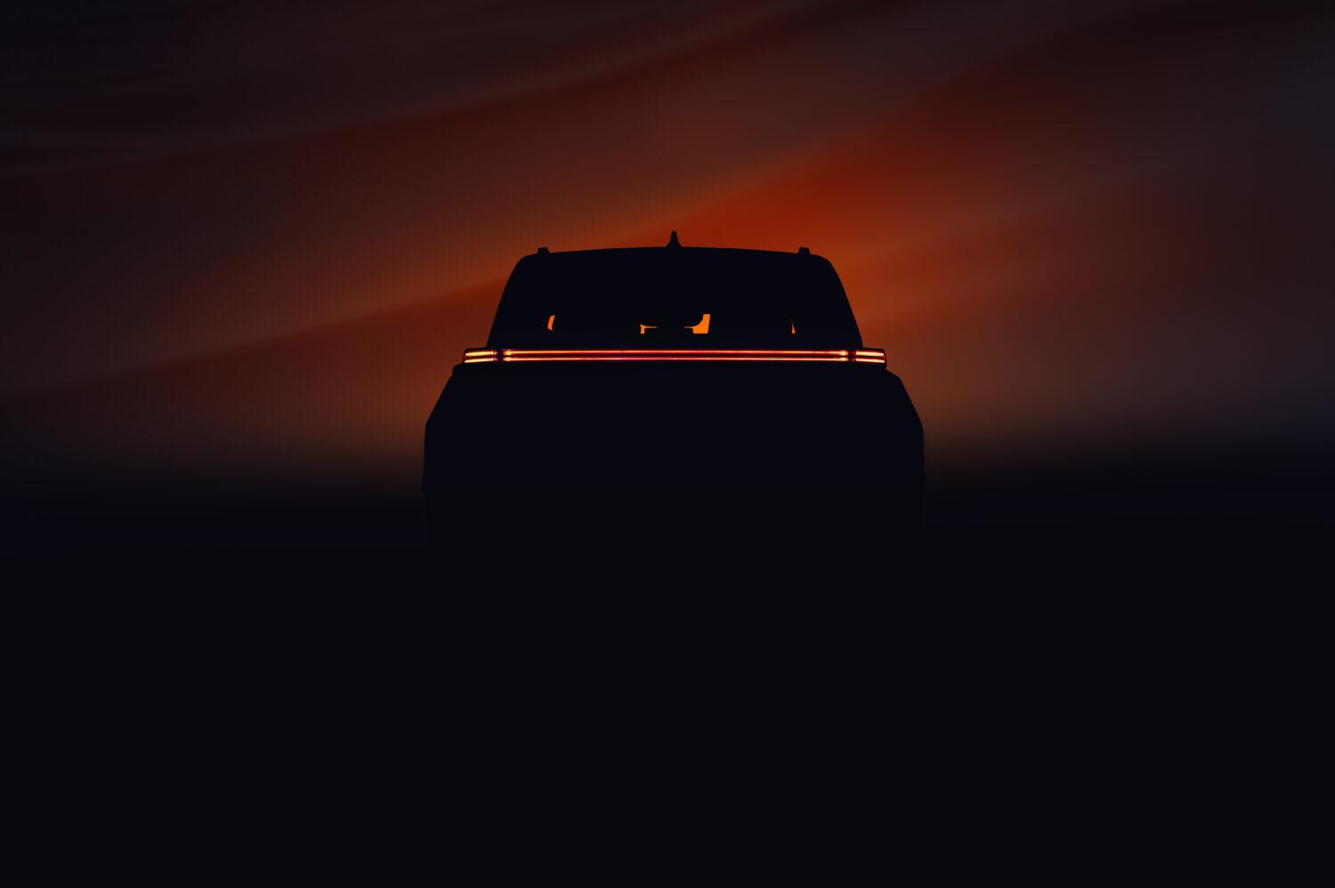 Wzrok przykuwa przede wszystkim biegnąca przez całą szerokość tyłu listwa świetlna, w której zamknięto dwa smukłe pasy LED wewnątrz prostokątnego klosza. Ciekawym aspektem są również proporcje, w tym dach o prostych liniach, widoczne relingi oraz masywne błotniki, co sugeruje auto o terenowym lub użytkowym charakterze. Przez tylną szybę widzimy masywne zagłówki oraz wystający ekran systemu inforozrywki.