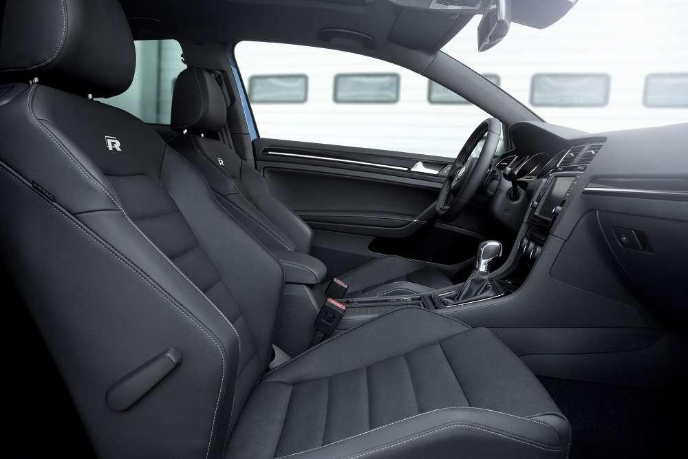 "Podobnie jak u trzech poprzedników Golfa R, Volkswagen R GmbH w znacznym stopniu zindywidualizował także wnętrze nowego modelu. Seryjnie najmocniejszy z Golfów jest wyposa-żony w sportowe przednie fotele. Środkowe części siedzeń są pokryte tkaniną Race w kolorze tytanowo-czarnym, z czarnymi szwami. Boki siedzeń obszyte są Alcantarą w odcieniu szarym Kristal. Na zewnętrznych częściach foteli i zagłówkach zastoso-wano tkaninę Clip w kolorze tytanowo-czarnym. Popielate szwy tworzą kontrast z ciemną tapicerką, a na oparciach przednich siedzeniach wytłoczone jest logo „R”.